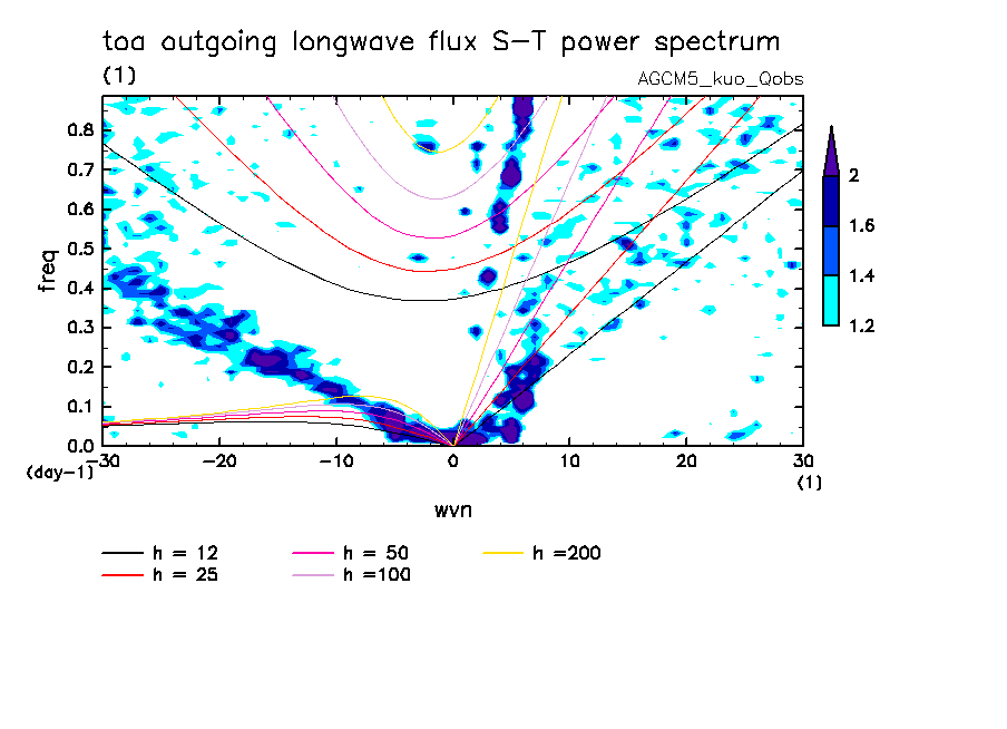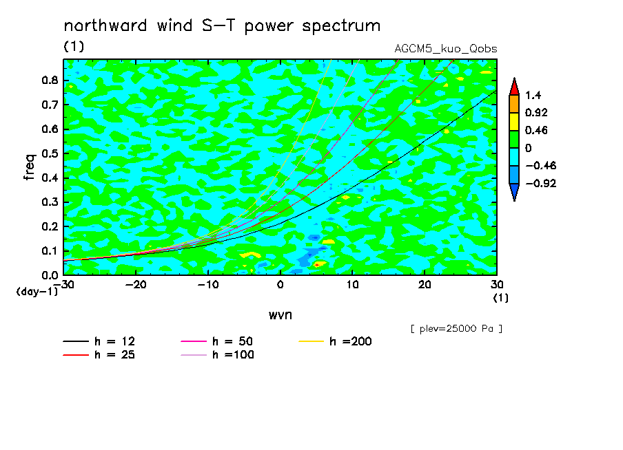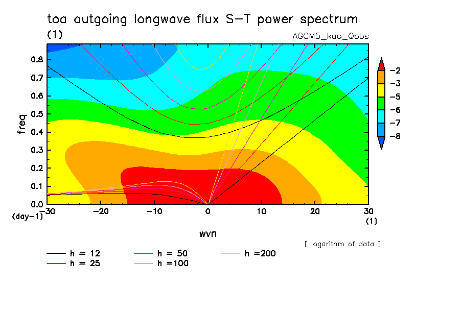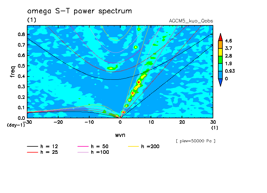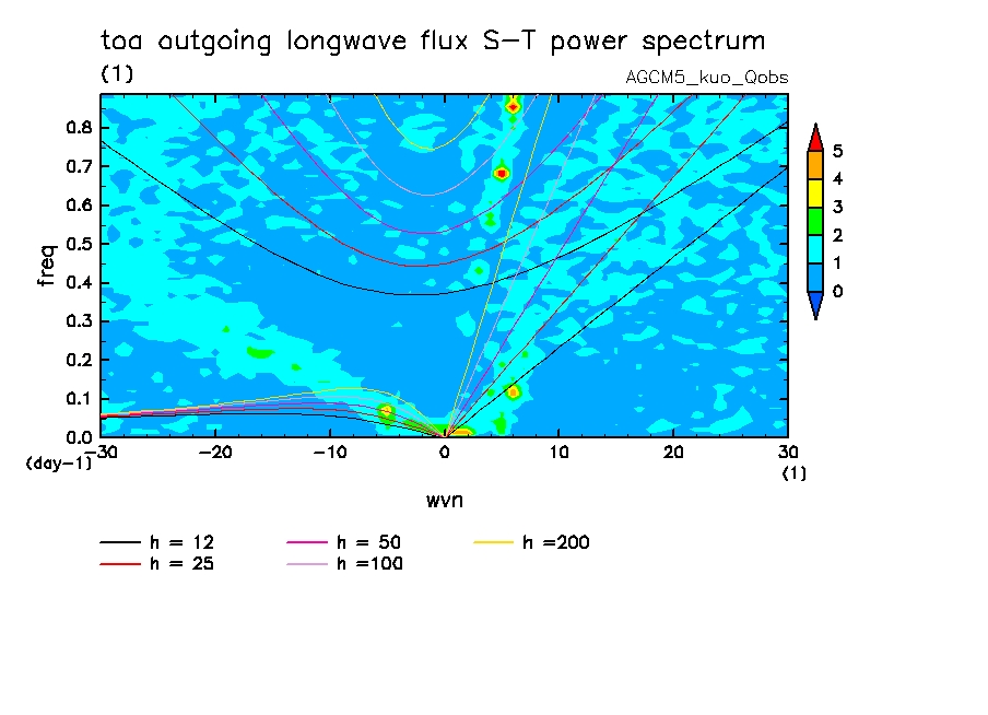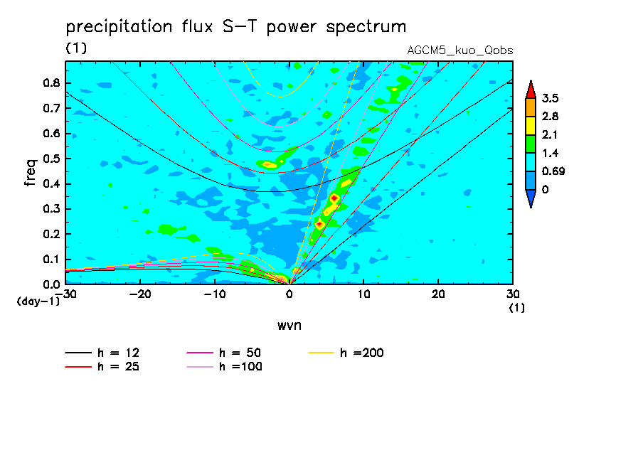 << Aqua Planet: Wheeler and Kiladis (1999) Plot from 'qobs' Experiment >> group: AGUforAPE model: AGCM5 (kuo scheme)