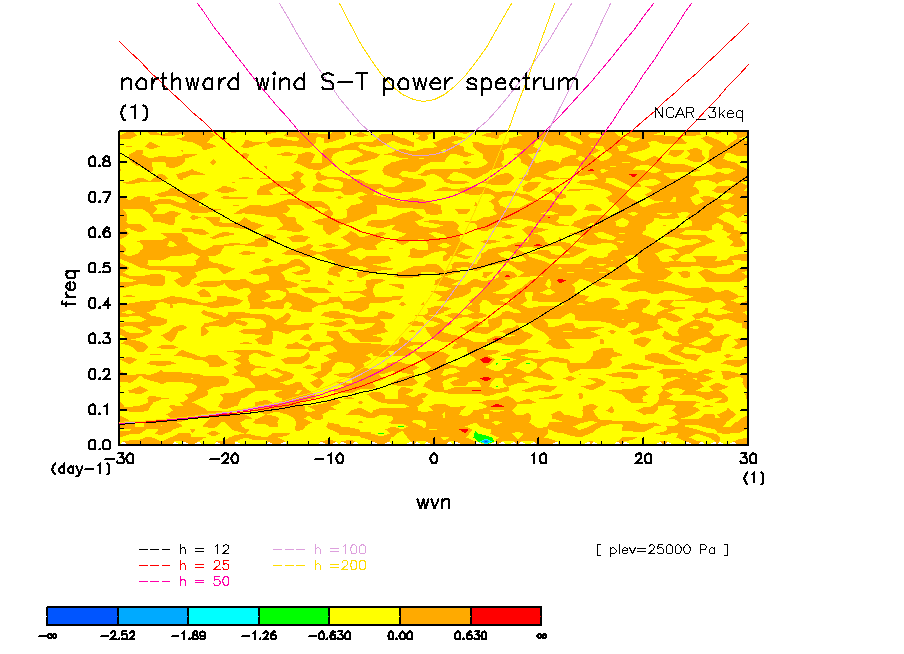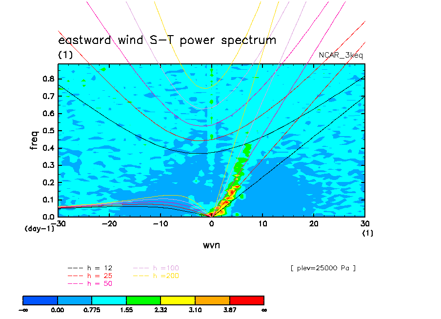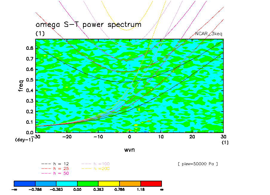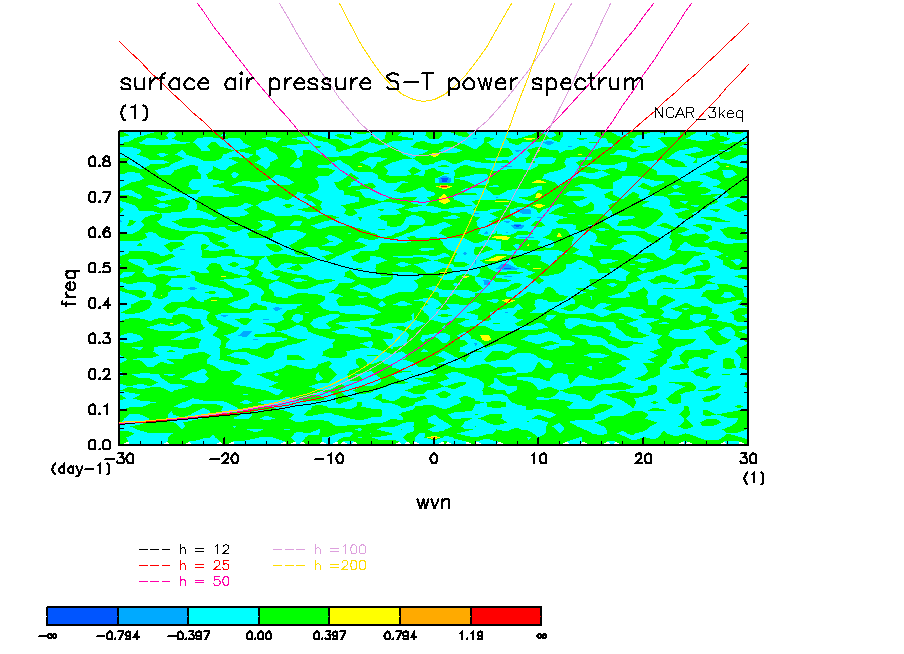 << Aqua Planet: Wheeler and Kiladis (1999) Plot from '3keq' Experiment >> group: NCAR (National Center for Atmospheric Research, Boulder, Colorado, USA) model: CCSM CAM2