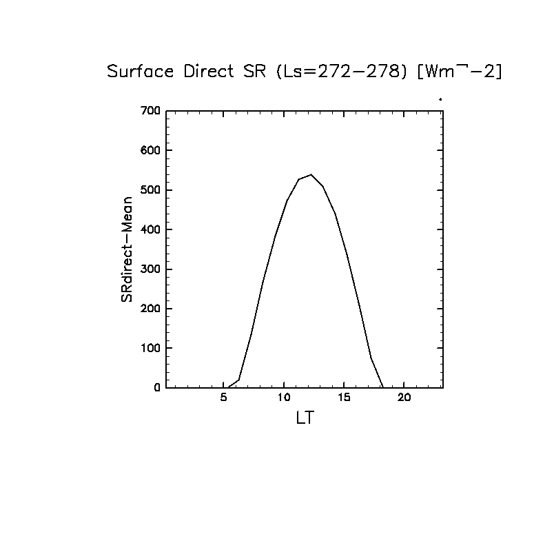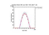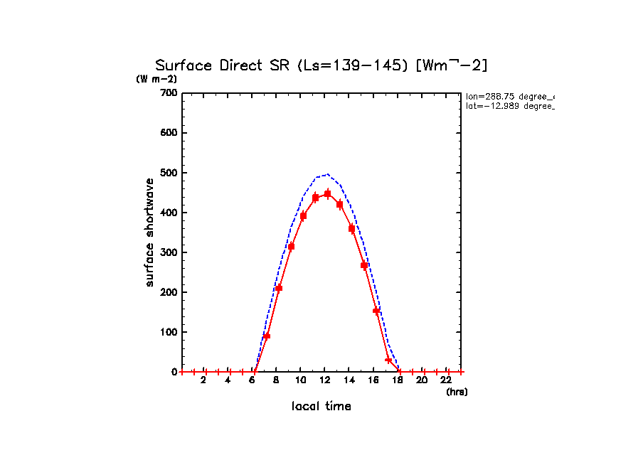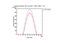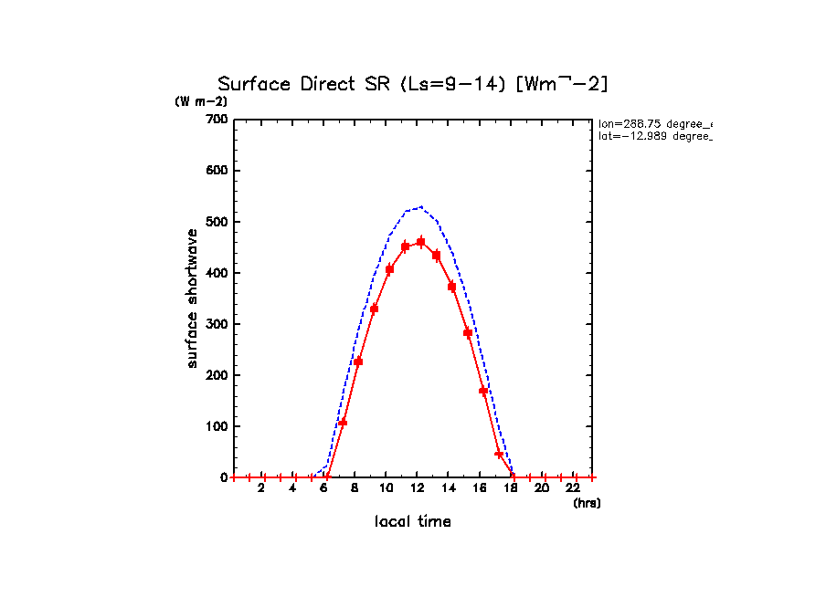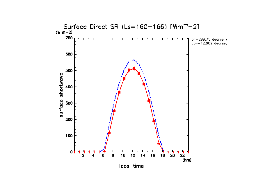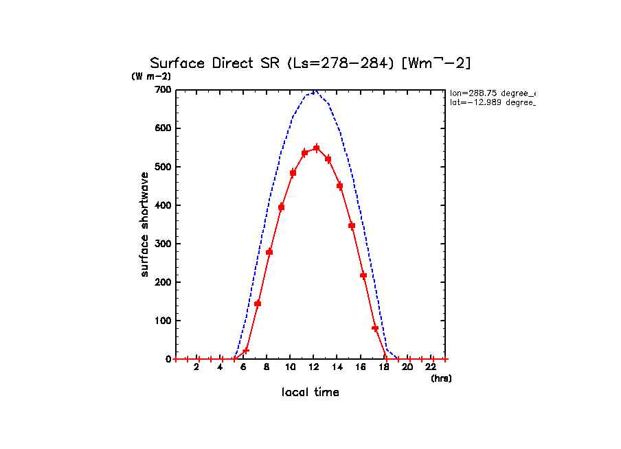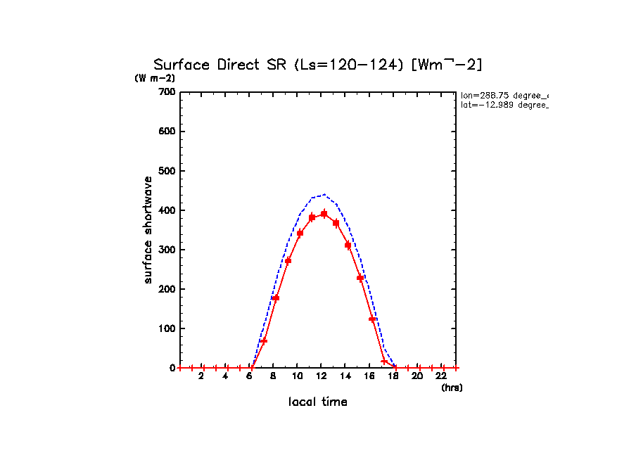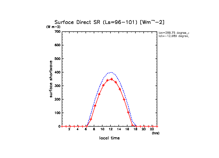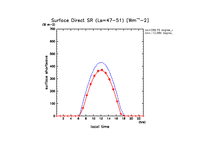 地表における直達太陽放射 (下向きを正, 実線は平均, 破線は大気上端)