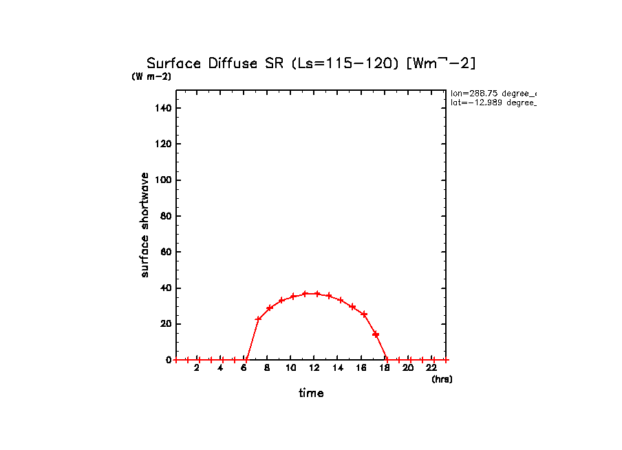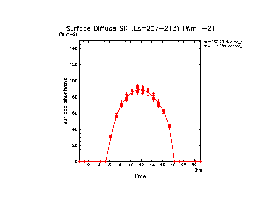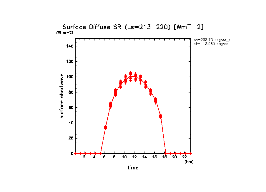 地表における太陽放射の散光成分 (下向きを正, 赤実線は平均)