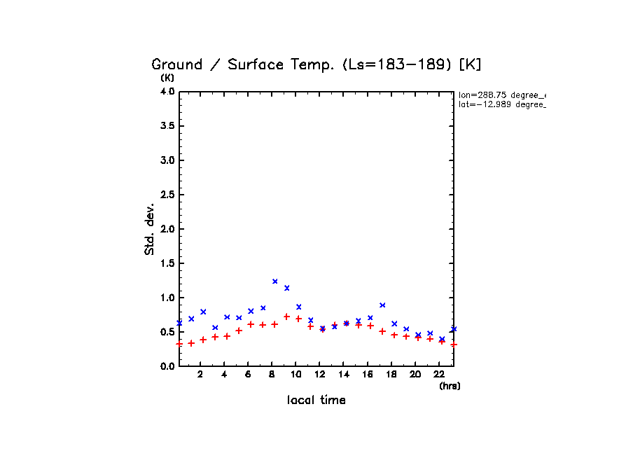地表面温度(赤)と地表気温(青: z=1m の換算値)の標準偏差