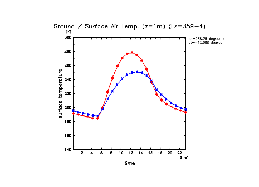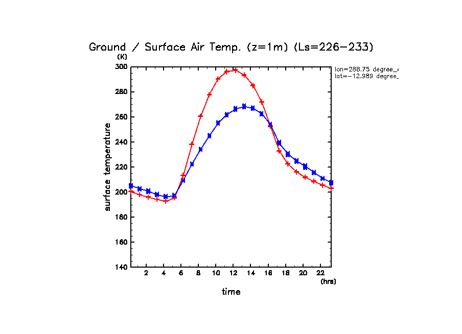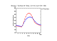 地表面温度(赤)と地表気温(青: z=1m の換算値) (実線は平均)
