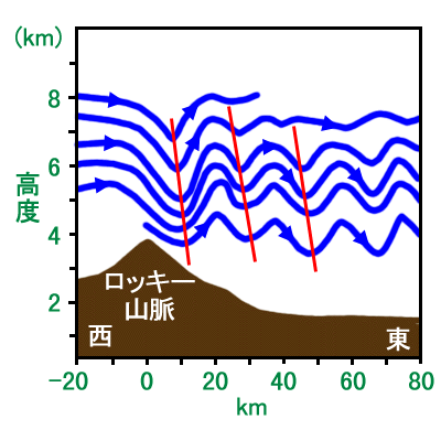 実際の大気の中でも, 山の後ろにこのような波ができる. この図は西風がロッキー山脈を越えた後に波打つ様子である 4). (垂直スケールが10倍になっていることに注意)