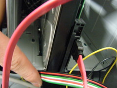 DVDドライブ, HDDと電源をつなぎます. ケーブルがたくさんあるので種類に注意. これはHDDとつなぐためのもの.細長いL字の口が特徴的. このL字口はHDD側に取り付けます. |