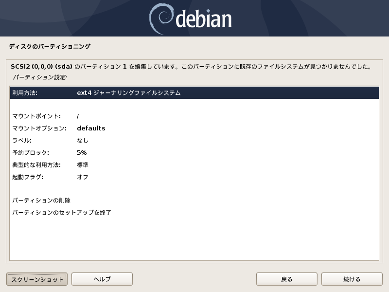 利用方法が「ext4 ジャーナリングファイルシステム」であることを確認し (違う場合には変更して), 「起動フラグ」をオンにして (ダブルクリック, もしくは選択して「続ける」)(joho7, joho8 はオフ), 「パーティションのセットアップを終了」を選択し, 「続ける」