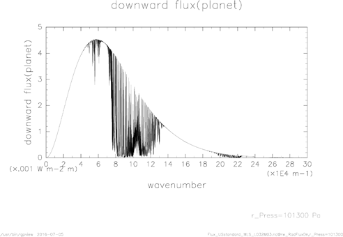 大気上端での上向きフラックス (惑星大気から宇宙空間へ射出される放射フラックス) は, Gphys のコマンドを以下のように使って描画することができます.