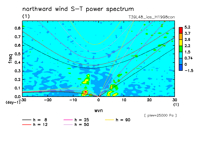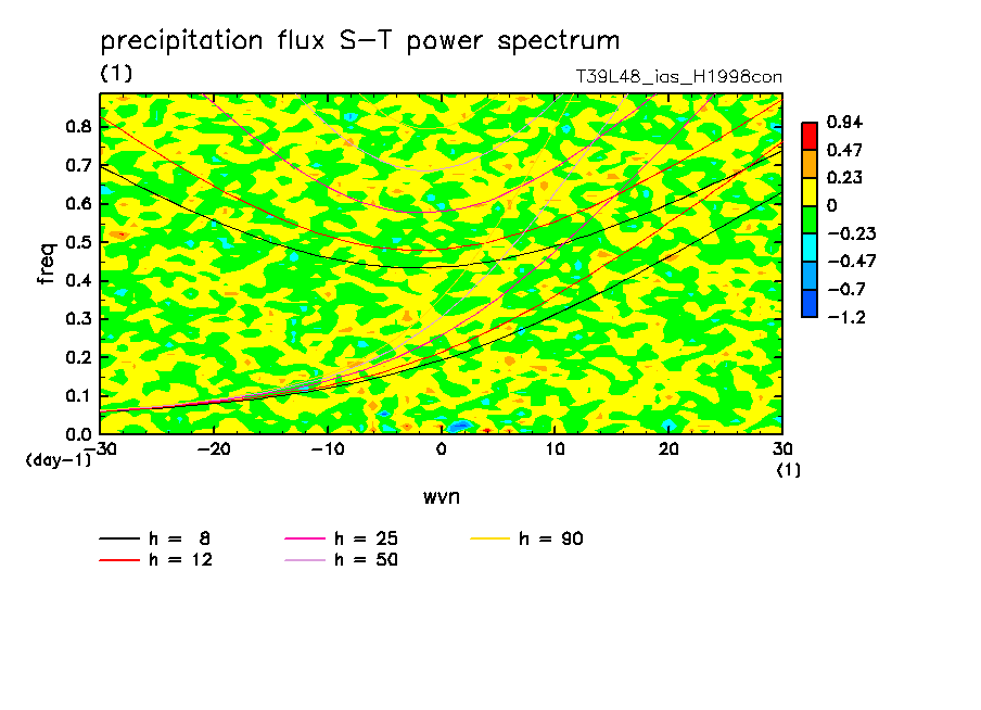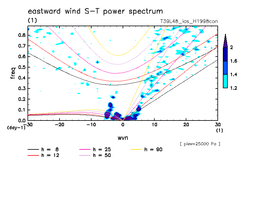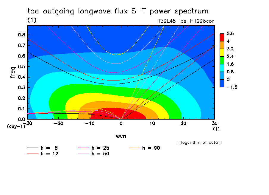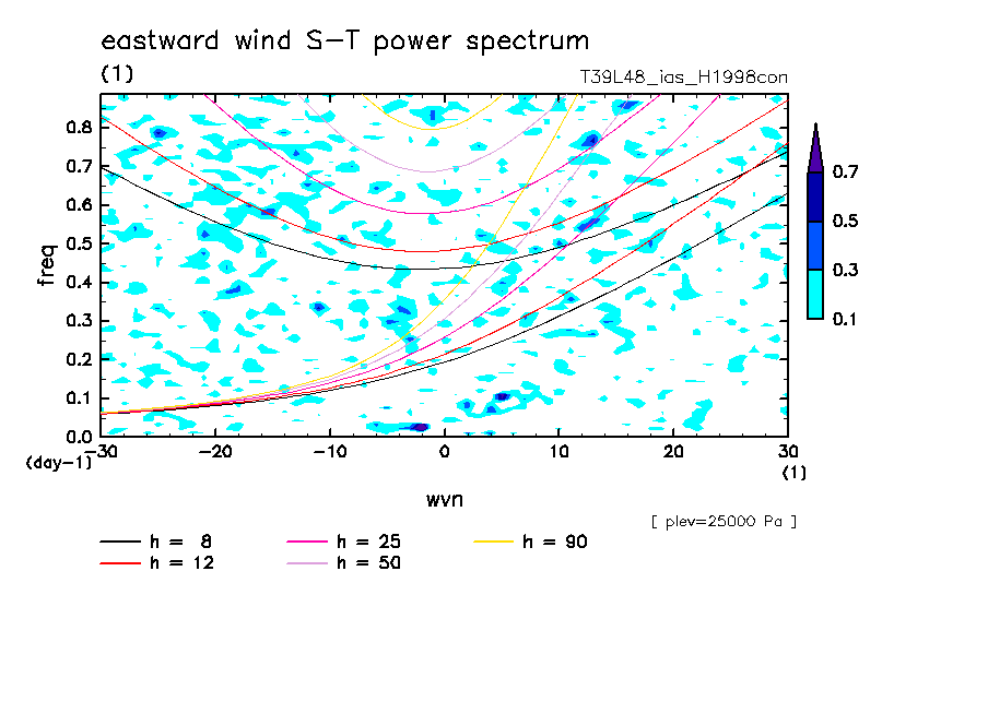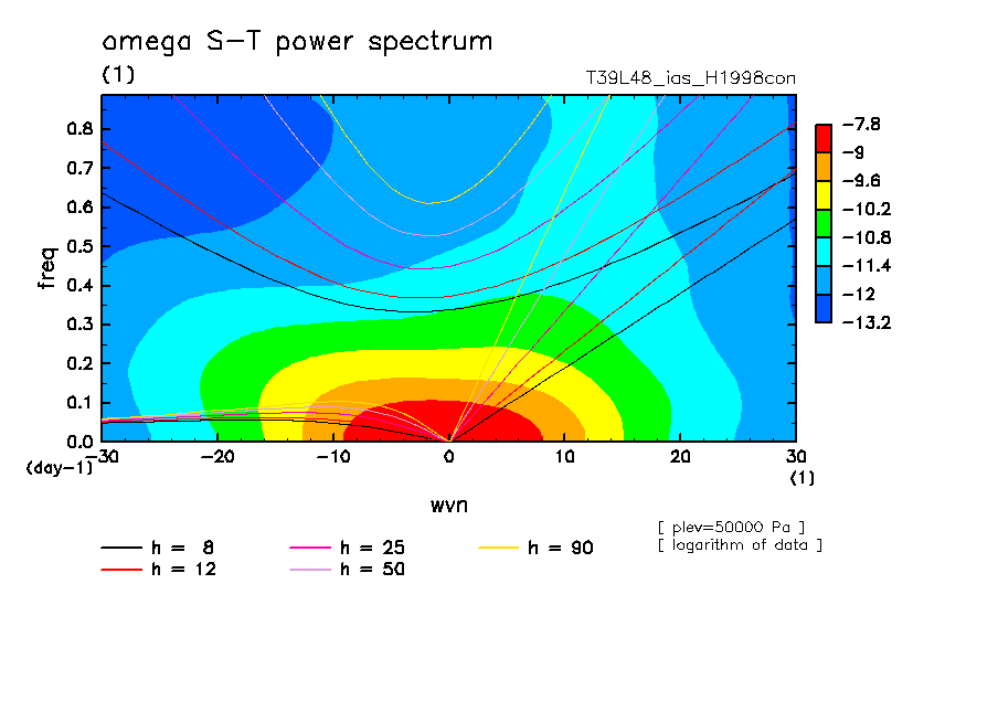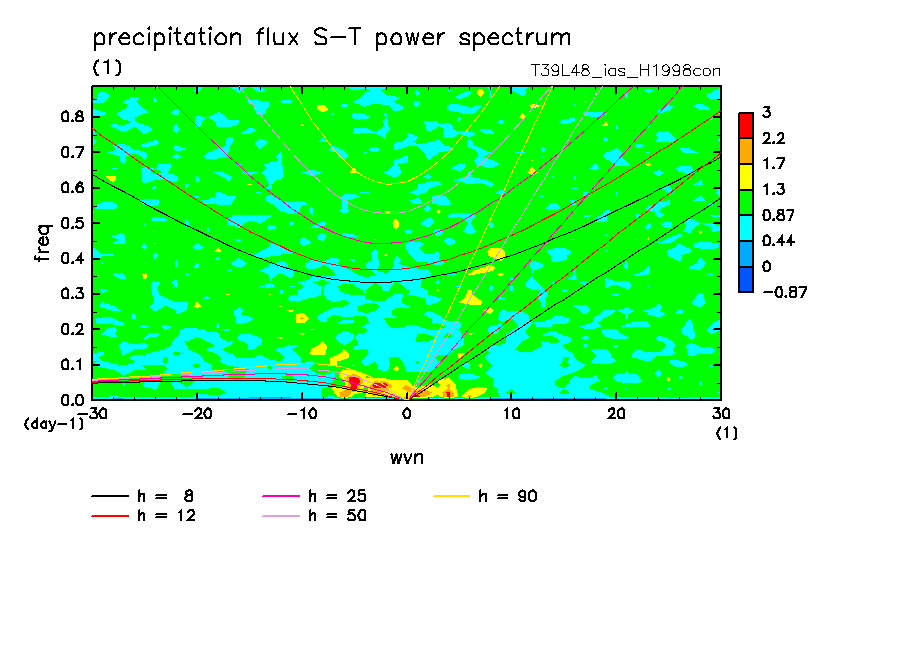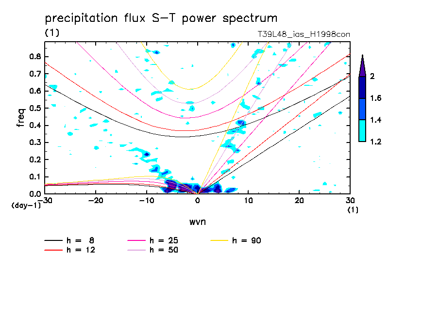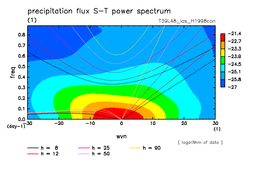 << Aqua Planet: Takayabu (1994), Wheeler and Kiladis (1999) Plot from 'H1998con' Experiment >> resolution: T39L48, cumulus parameterization: imposed Arakawa-Shubert scheme, Original data produced: 2004/05 on ES.