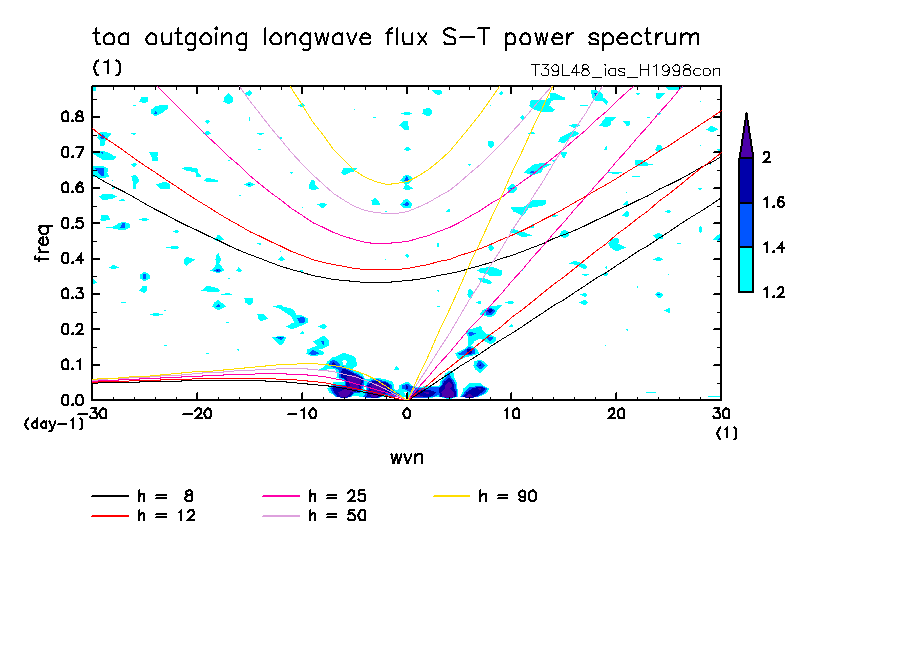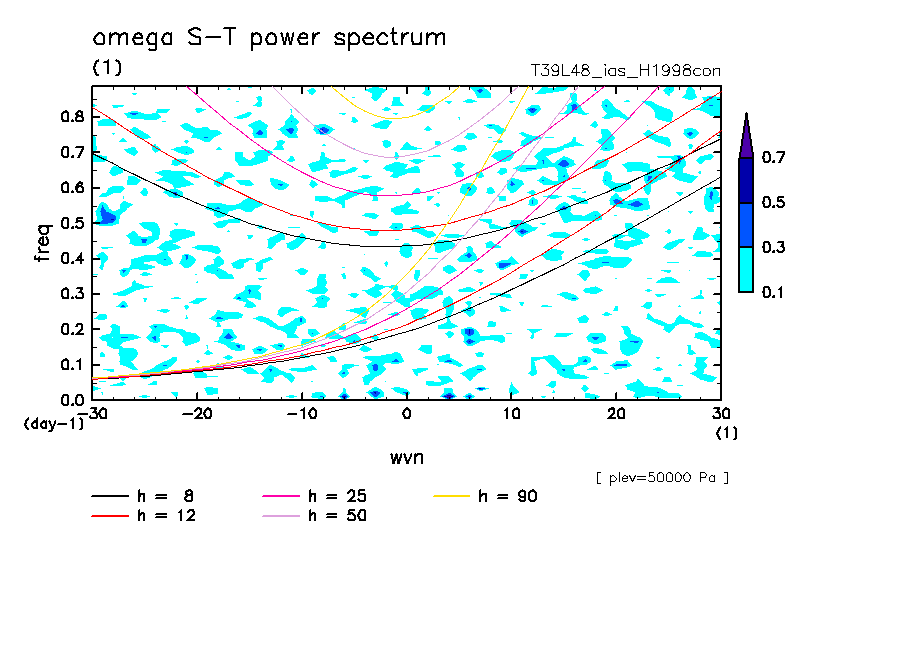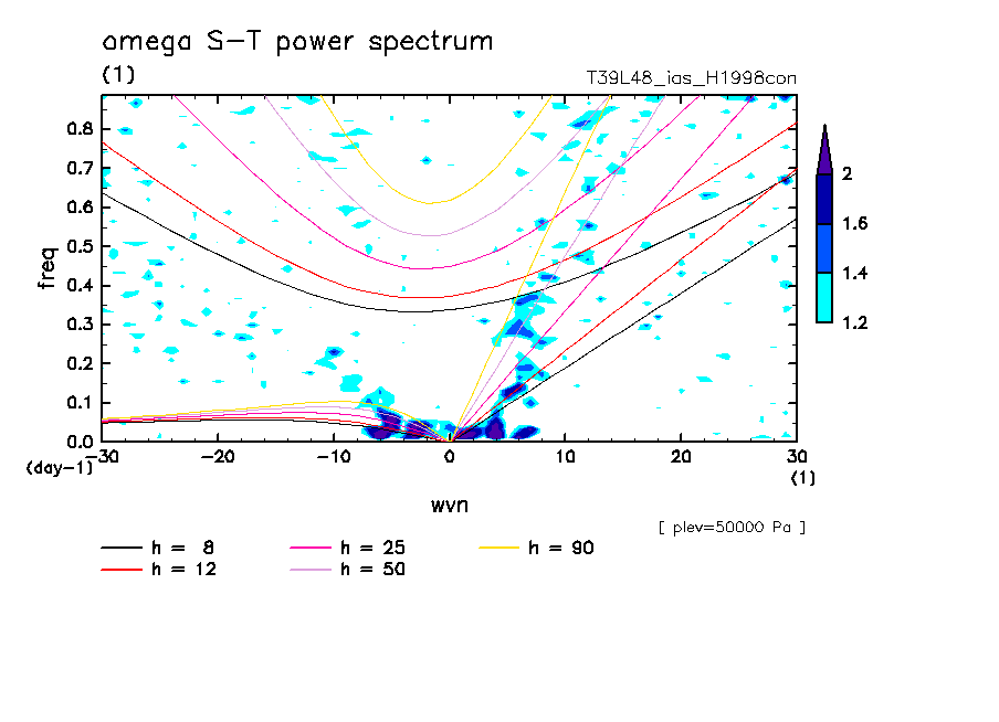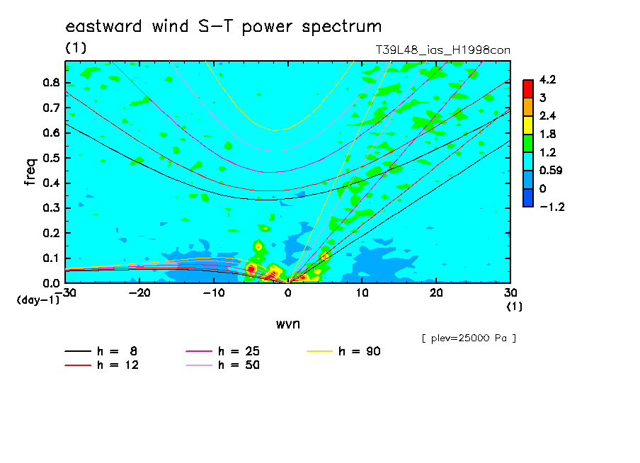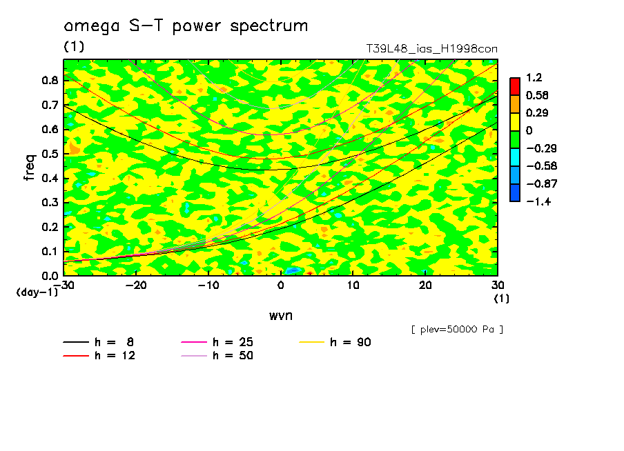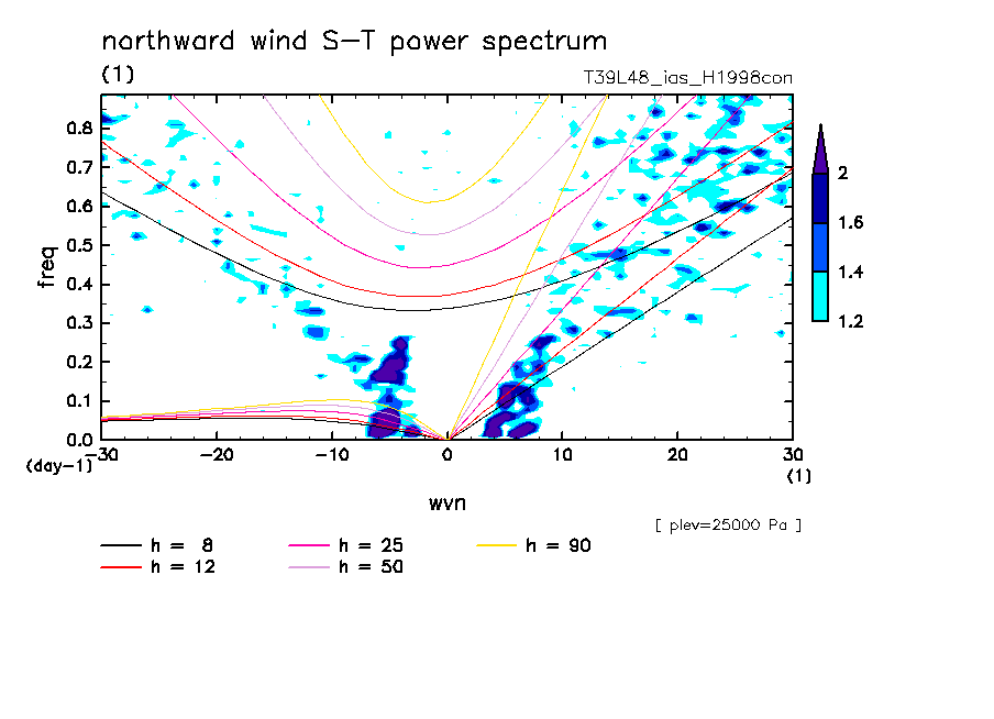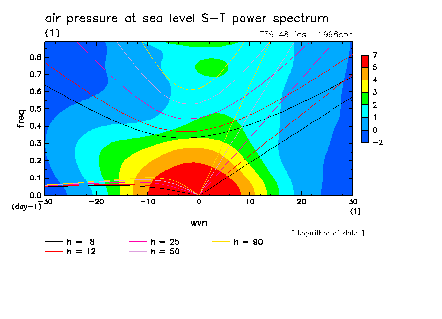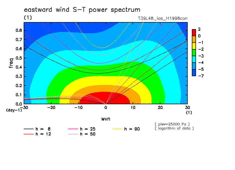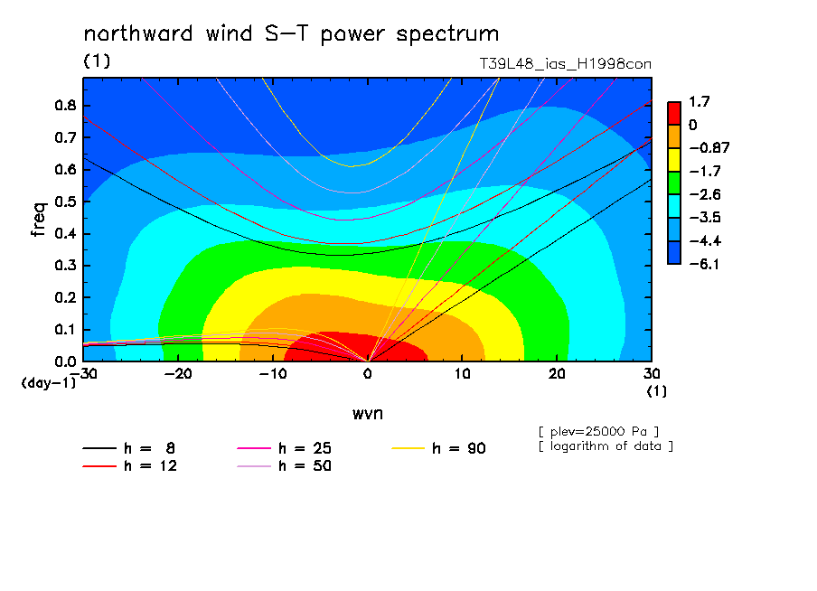 << Aqua Planet: Takayabu (1994), Wheeler and Kiladis (1999) Plot from 'H1998con' Experiment >> resolution: T39L48, cumulus parameterization: imposed Arakawa-Shubert scheme, Original data produced: 2004/05 on ES.