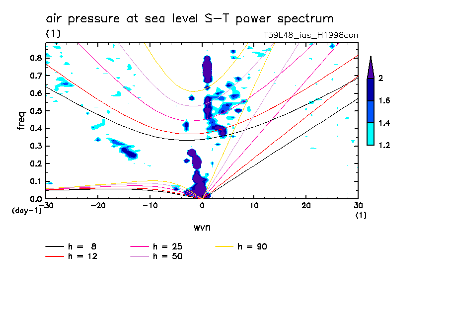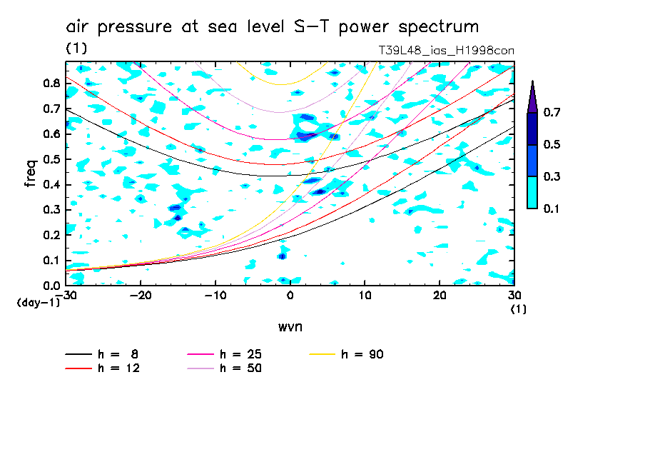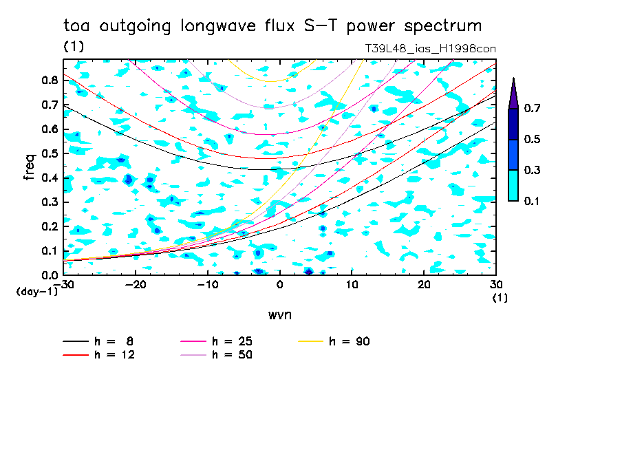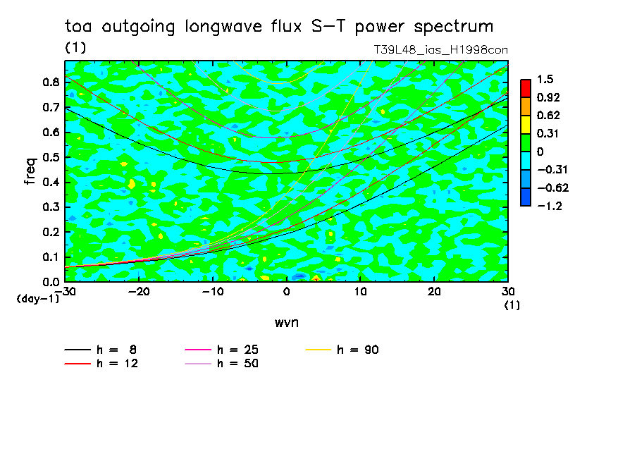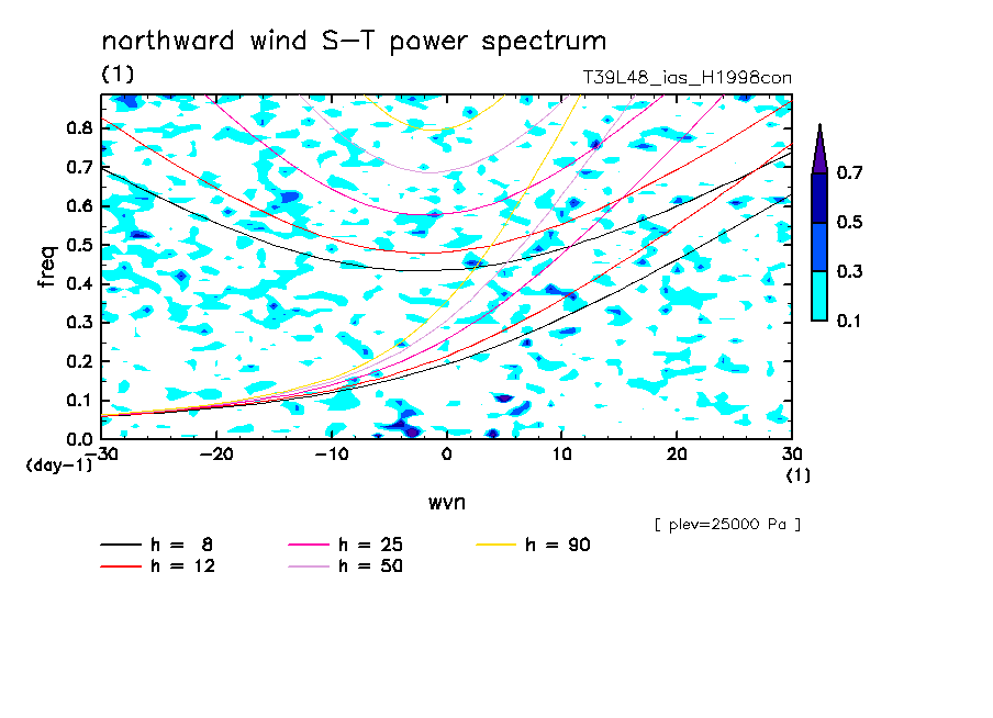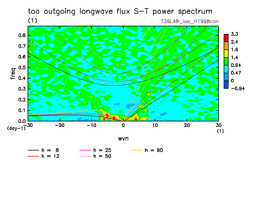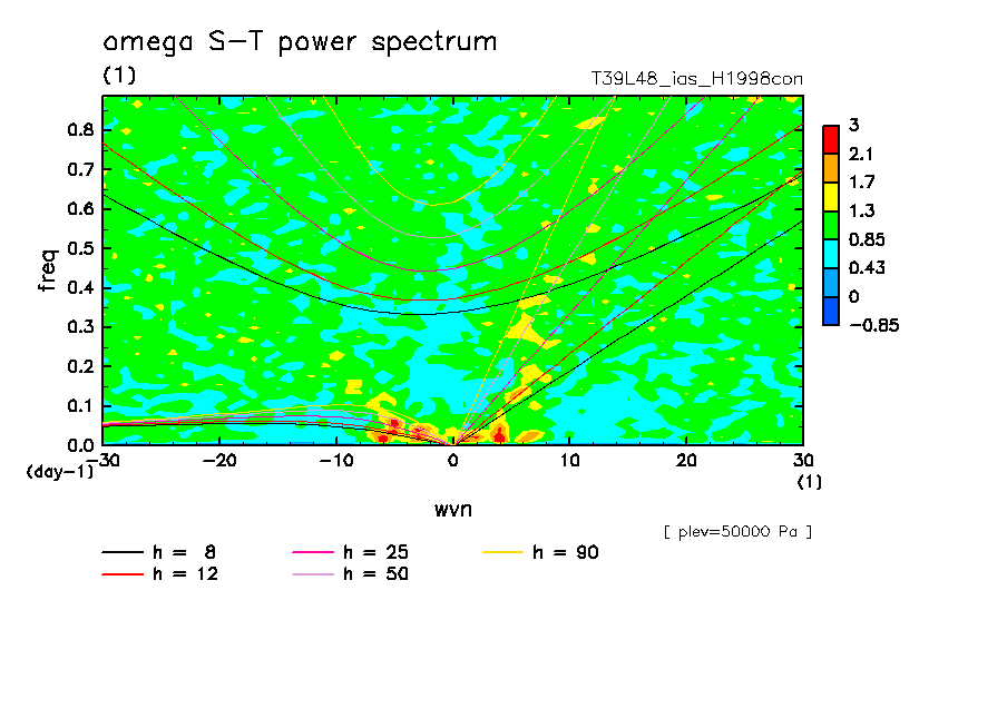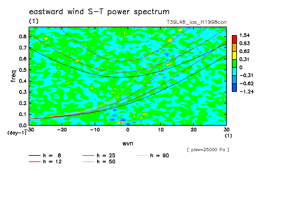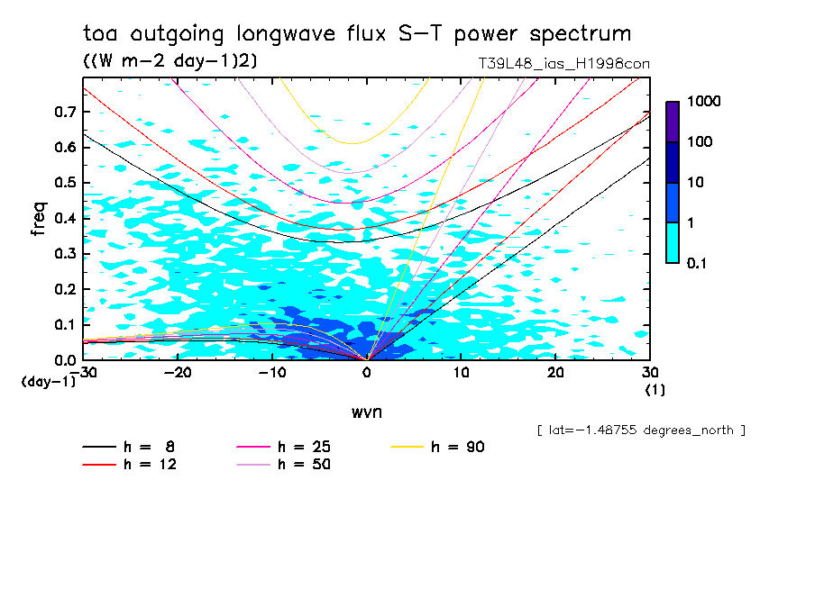 << Aqua Planet: Takayabu (1994), Wheeler and Kiladis (1999) Plot from 'H1998con' Experiment >> resolution: T39L48, cumulus parameterization: imposed Arakawa-Shubert scheme, Original data produced: 2004/05 on ES.