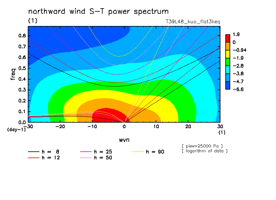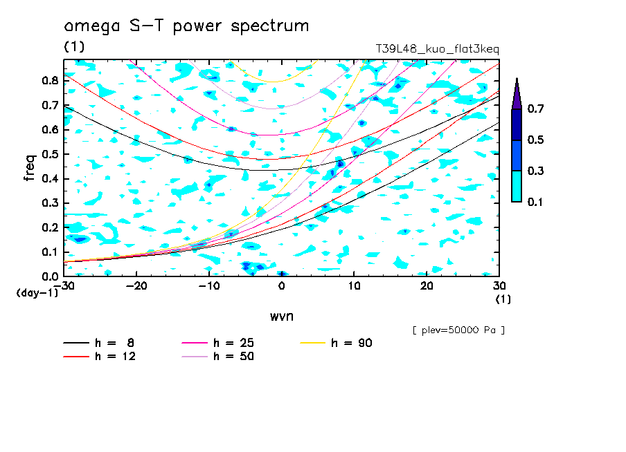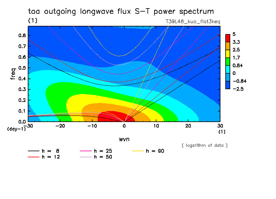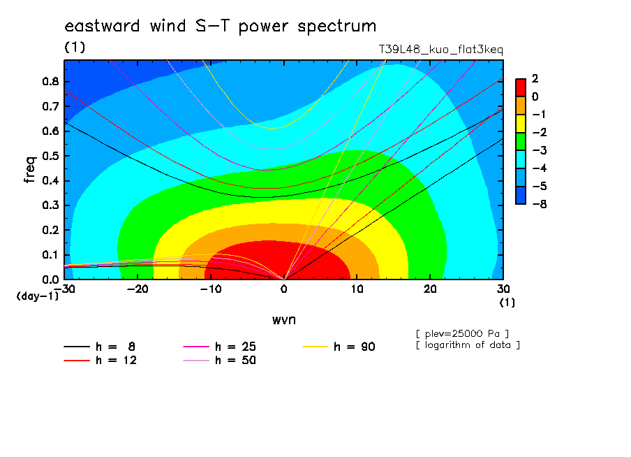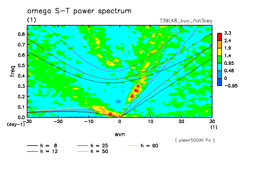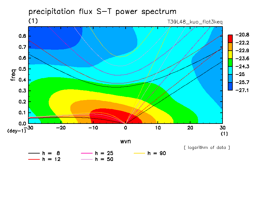 << Aqua Planet: Takayabu (1994), Wheeler and Kiladis (1999) Plot from 'flat3keq' Experiment >> resolution: T39L48, cumulus parameterization: Kuo scheme, Original data produced: 2004/05 on ES.
