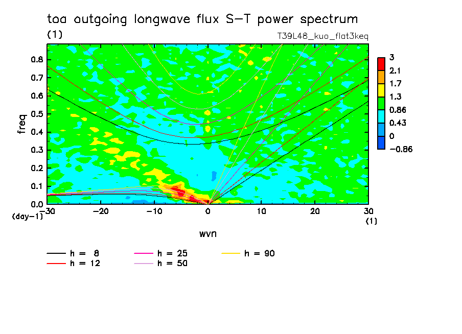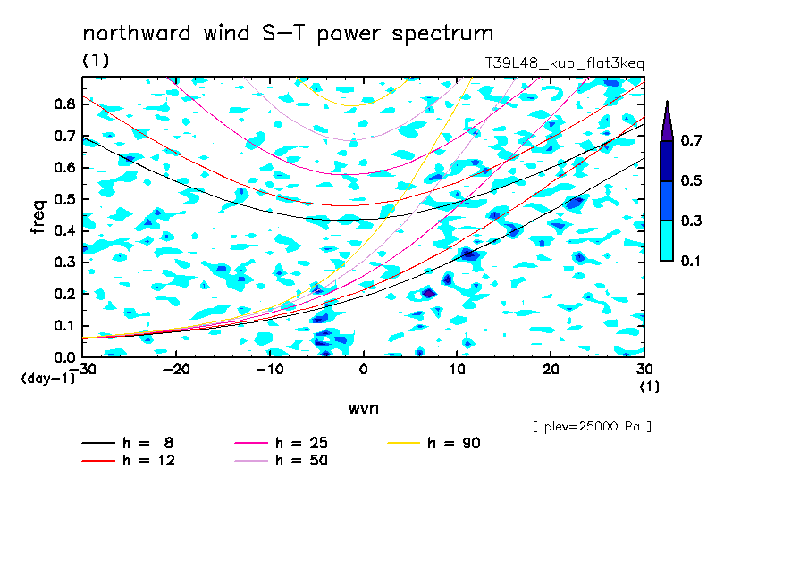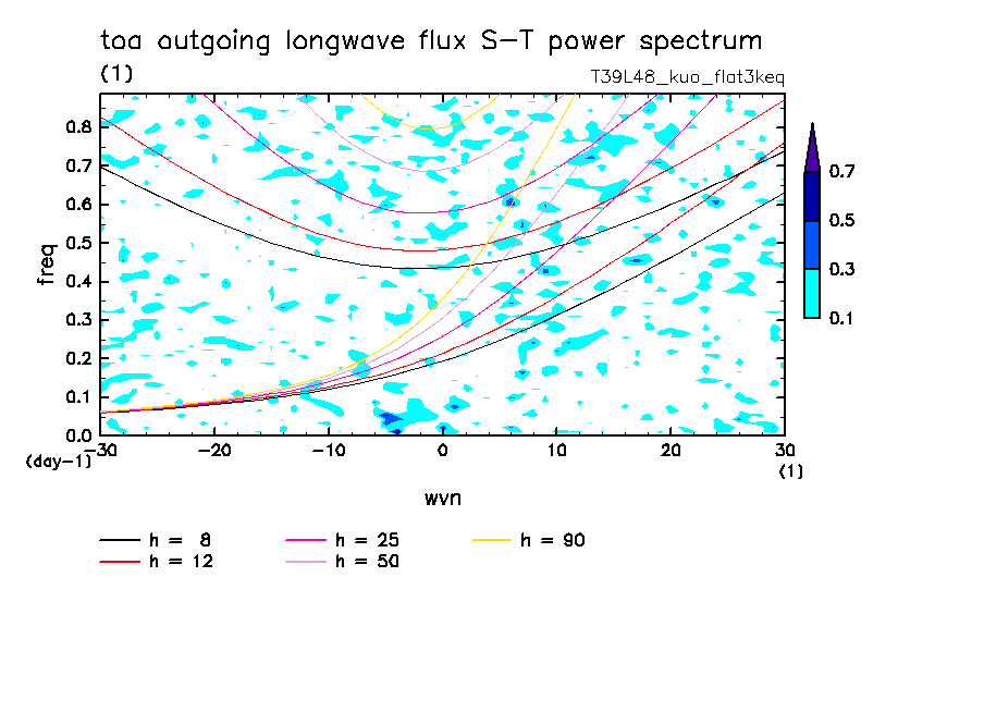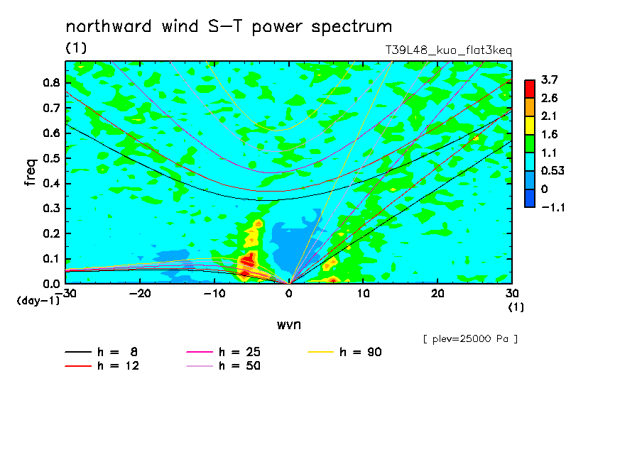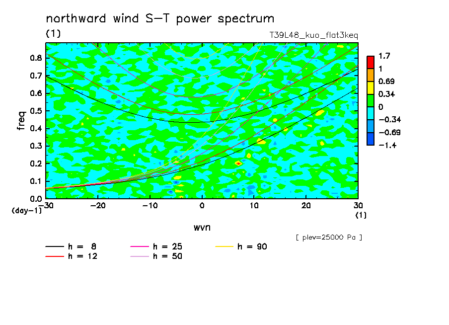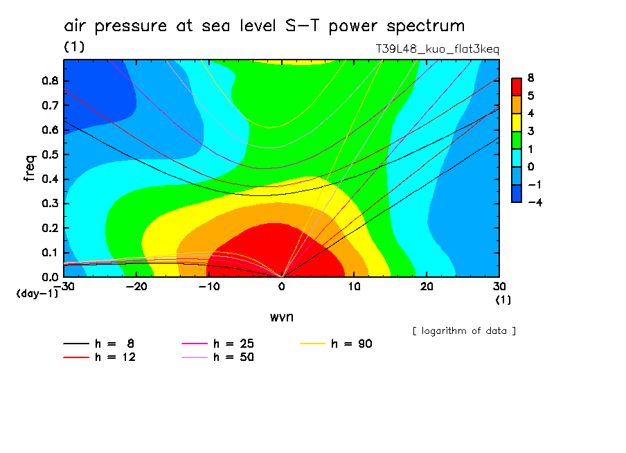 << Aqua Planet: Takayabu (1994), Wheeler and Kiladis (1999) Plot from 'flat3keq' Experiment >> resolution: T39L48, cumulus parameterization: Kuo scheme, Original data produced: 2004/05 on ES.