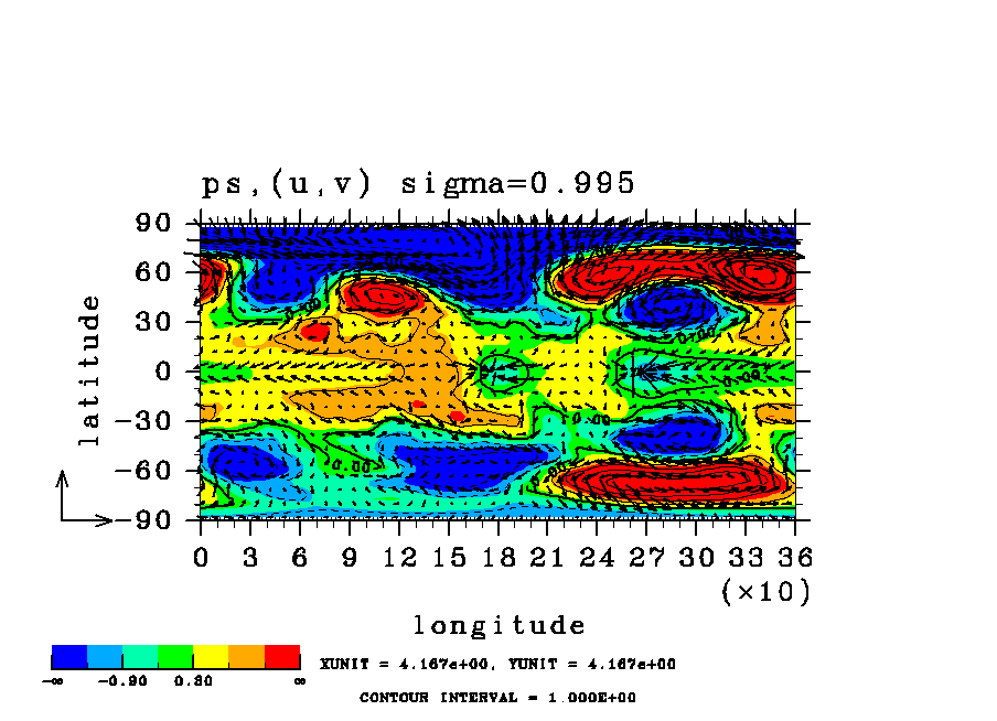 | 表面気圧の (x,y)水平分布図. | 降水の(x,y)水平分布図. (rain 瞬間値) |