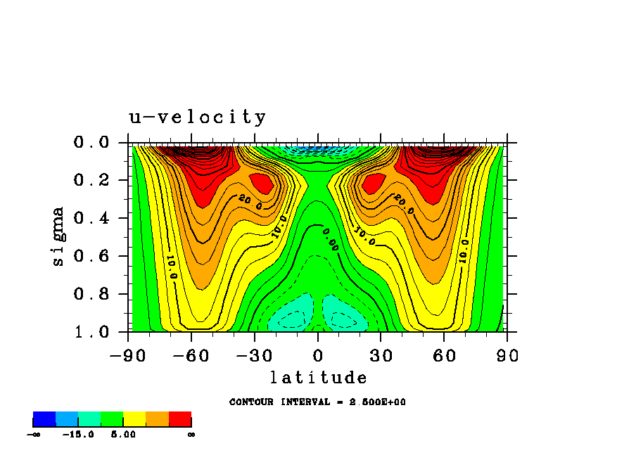 温度 + (u, -SigDot) の (x,z) 断面 at 赤道