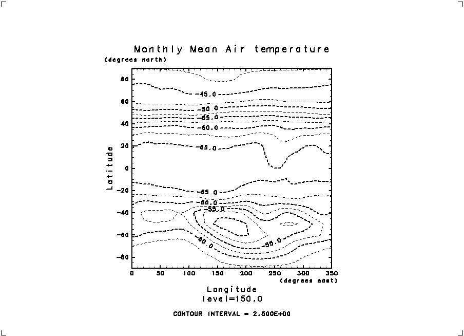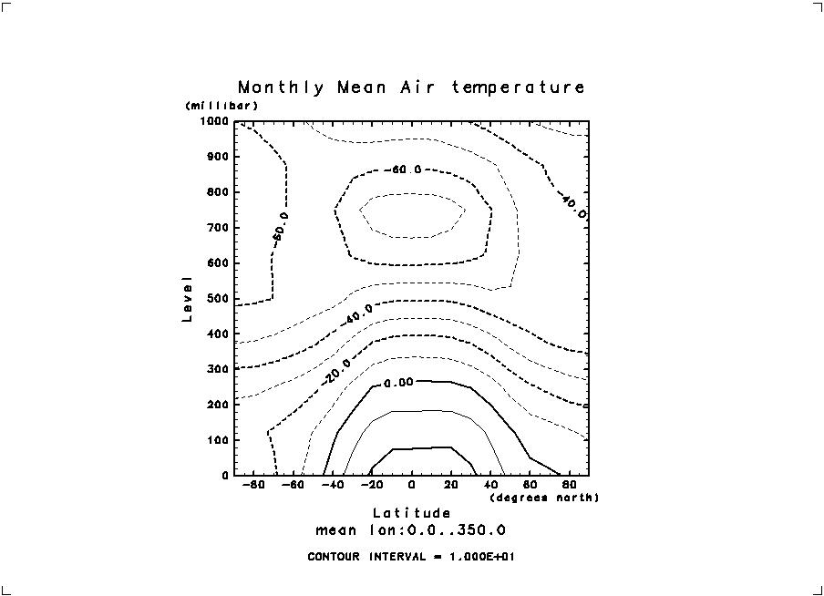 まずは絵を描いてみよう。 gphys-0.0.3 の配布パッケージにはテスト用に、T.jan.ncという NetCDFファイルが含まれているので、それを使う。 中身は NCEP 再解析による、全球の気温の気候値である。 まずは以下を実行してみよう。