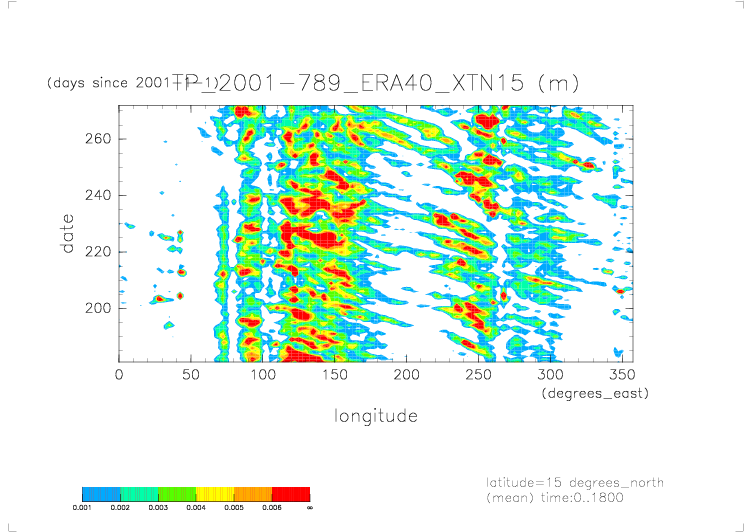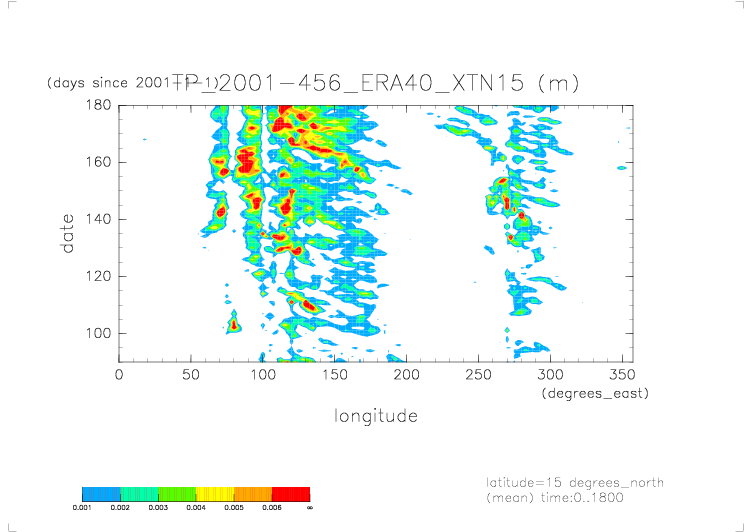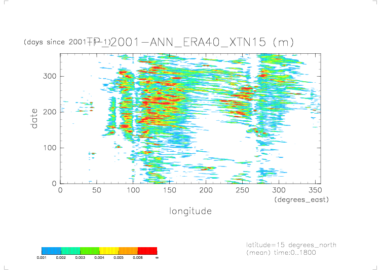 ../../Precip.2001.daily.ERA40/daily_TP* から得た X-T ダイアグラムの図. 北緯 15 度(latitude=15), 日平均.