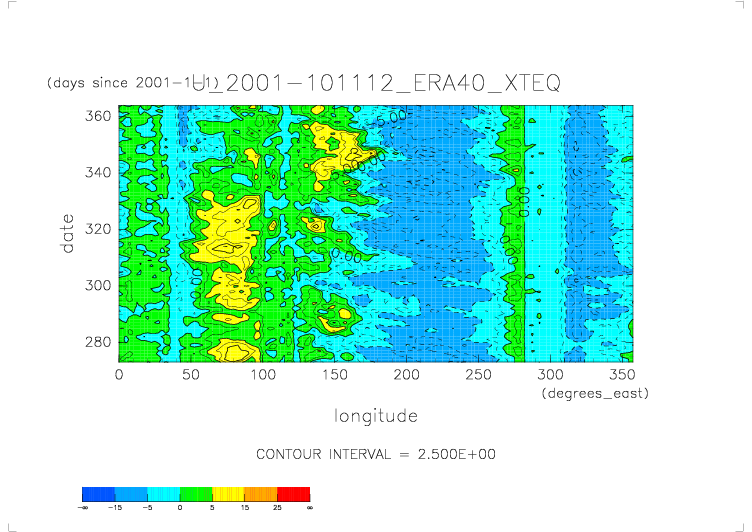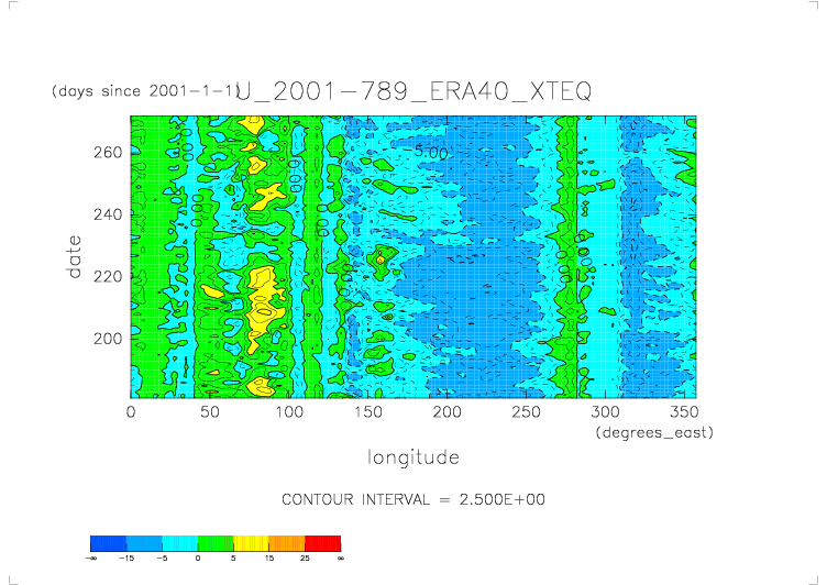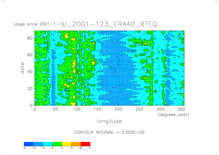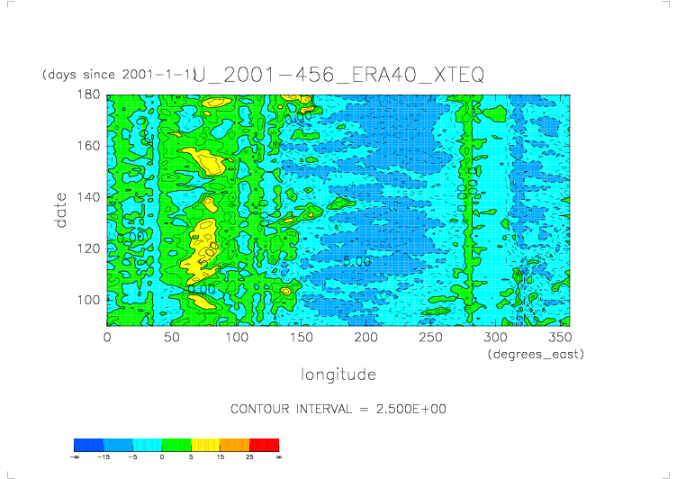 ../../U.2001.daily.ERA40/daily_U* から得た X-T ダイアグラムの図. 赤道(latitude=0), 地表面(levelist=1000), 日平均.