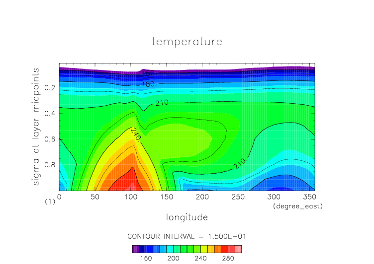 温度. 東西平均 (鉛直座標は対数プロット) |