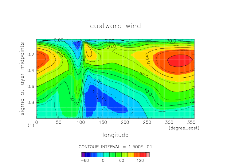 東西風. 赤道断面 (鉛直座標は対数プロット) |