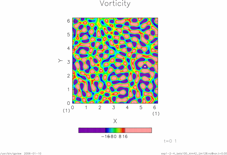 2 次元2重周期境界領域での順圧流体 : 減衰乱流問題実験 1-2 (4次ルンゲクッタ + 線形項の演算子分割処理法) 計算解析結果の図・アニメーション等置場