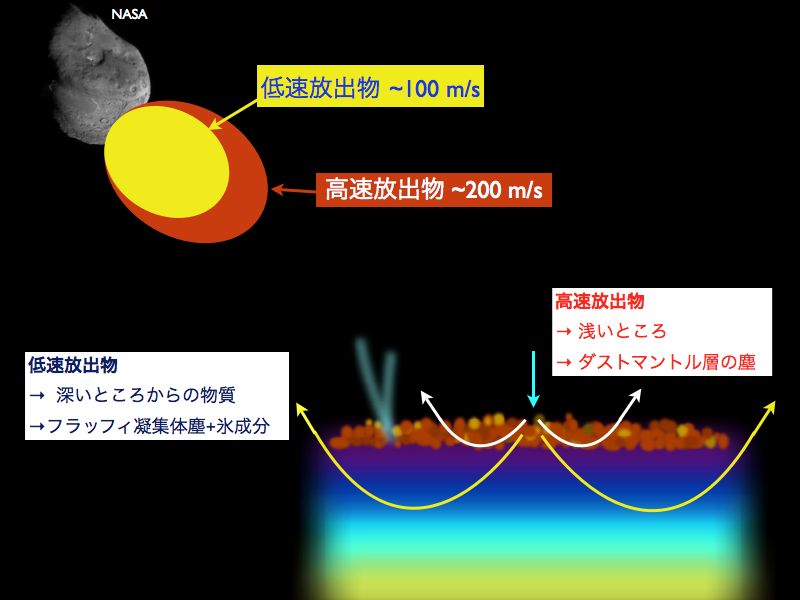 そして我々はこれらの高速放出物と低速放出物の光学特性の違いは、ダストマントル層の存在で説明できるのはないかと考えました。というのも、この放出速度の速いと遅いは、実は表層のどこから来たかによる違いで説明できるからです [19](上図)。 衝突クレーター形成過程において、衝突点付近かつ表面に近いところから飛び出してくる放出物の速度は一般に速くなると考えられます。 一方速度の遅い放出物は主に深いところから掘削されてくるのです。 つまり、高速放出物はダストマントルに存在するコンパクト凝集体塵に相当し、低速放出物には多数のフラッフィ凝集体塵(+揮発氷)が含まれていると考えることができます。 この仮説が正しいとすると、上に列挙した三つの地上観測データの違いは、このコンパクト凝集体塵とフラッフィ凝集体塵の光学的特徴の違いで説明できるはずです。