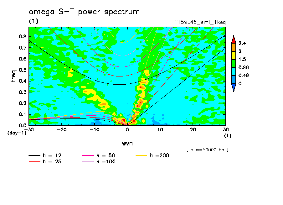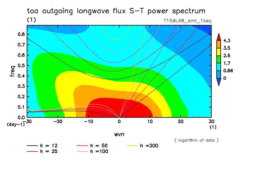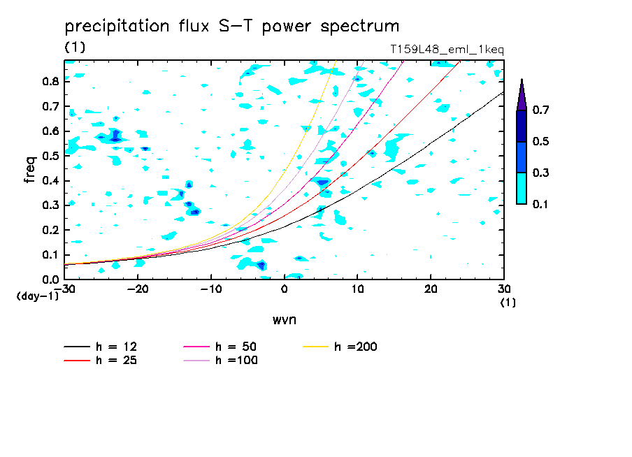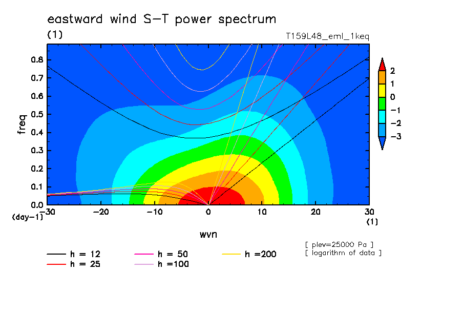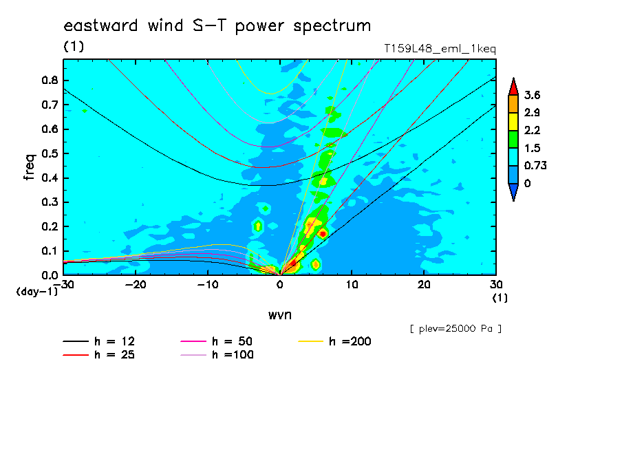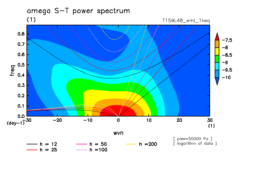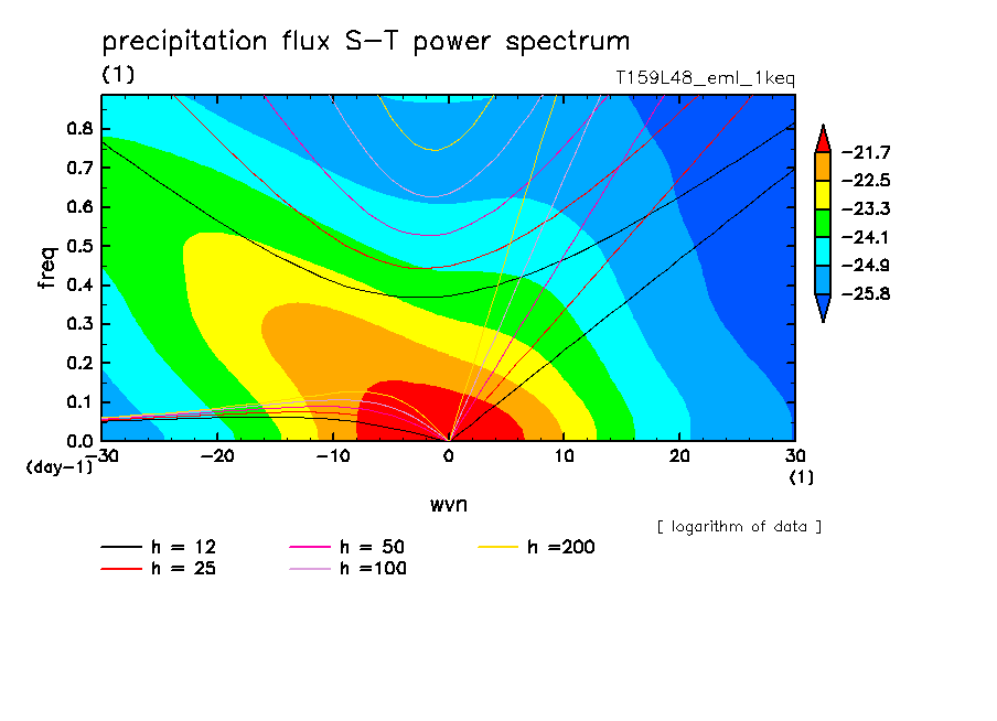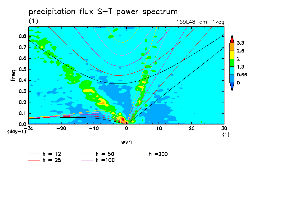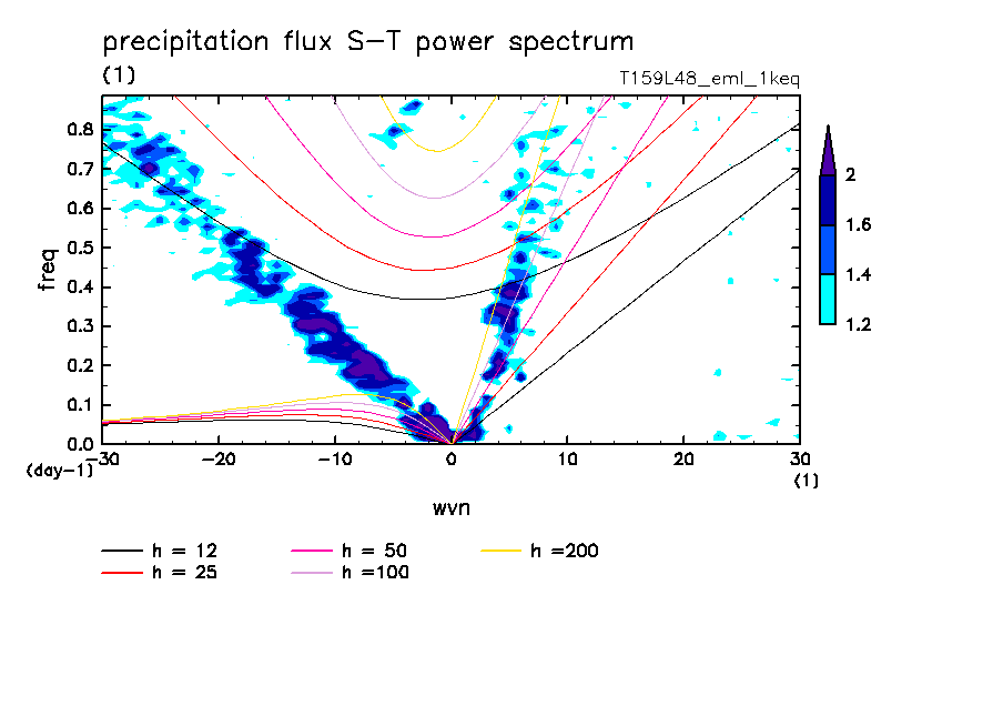 << Aqua Planet: Takayabu (1994), Wheeler and Kiladis (1999) Plot from '1keq' Experiment >> resolution: T159L48, cumulus parameterization: Emanuel scheme, radiation: every 3 hour, Original data produced: 2004/**/** on ES.