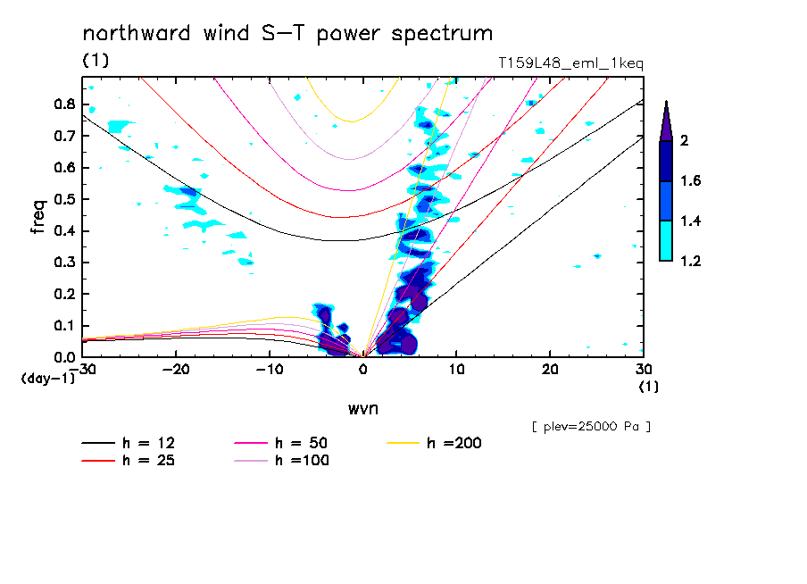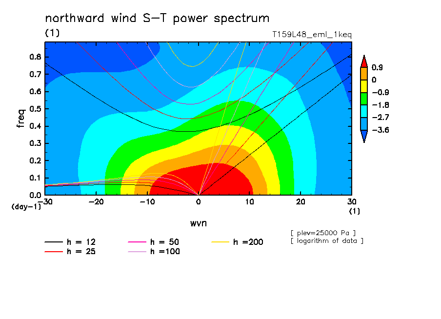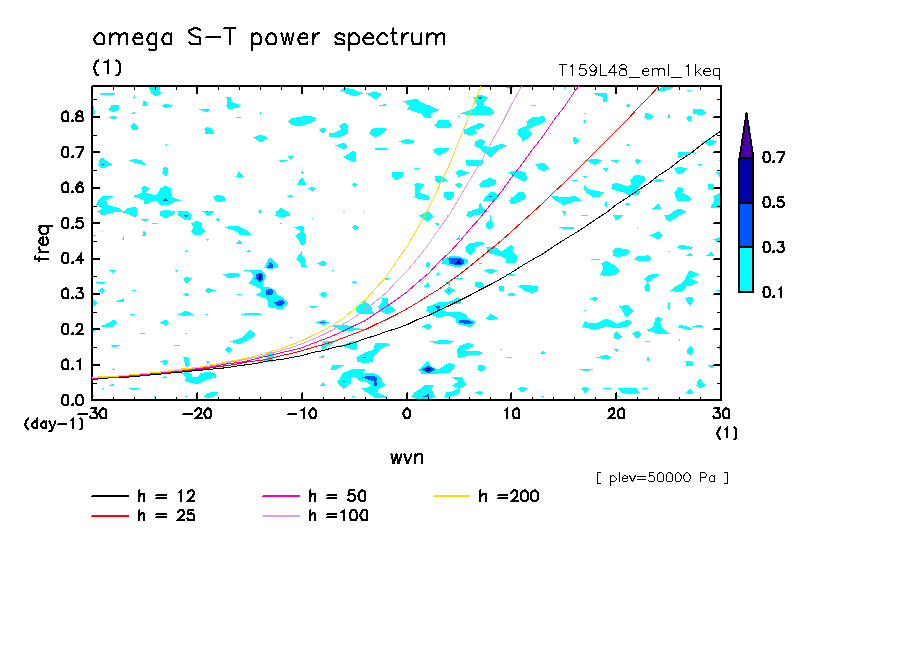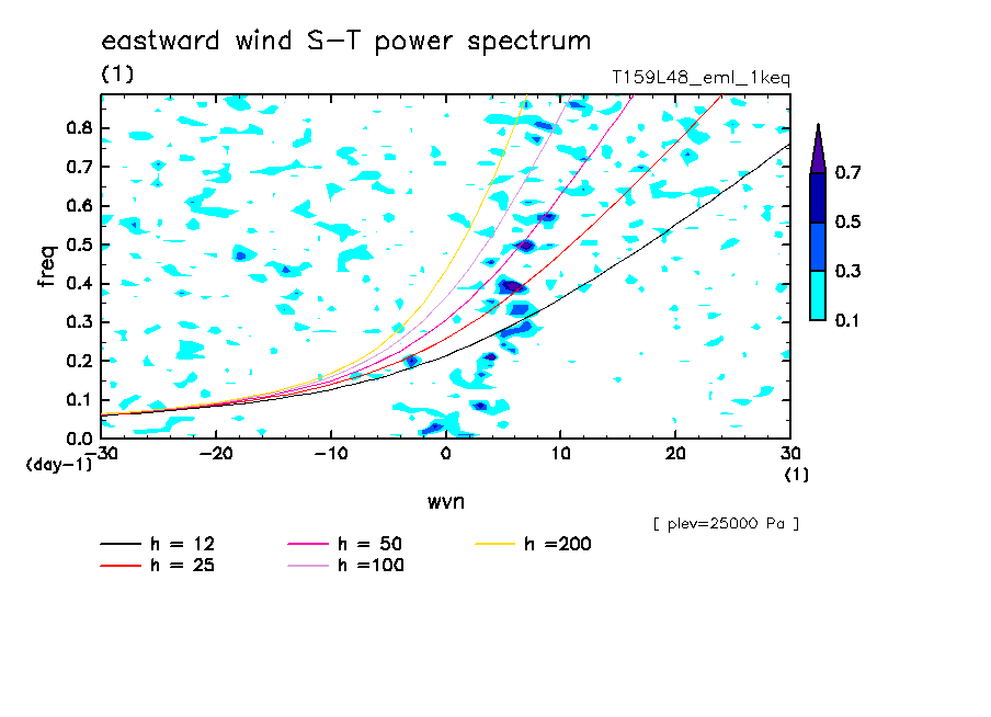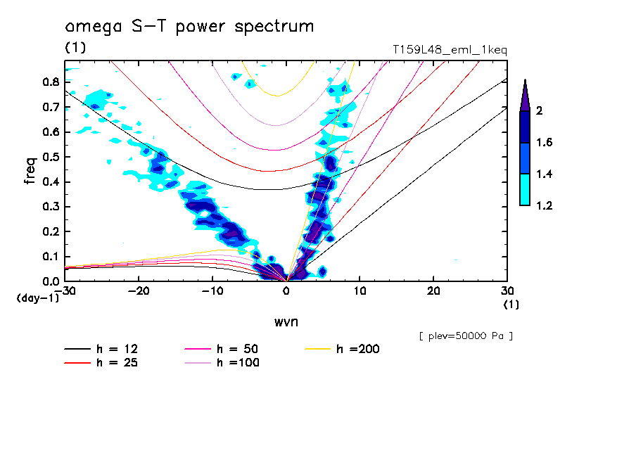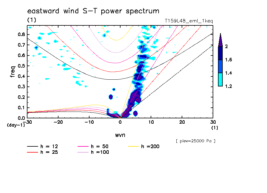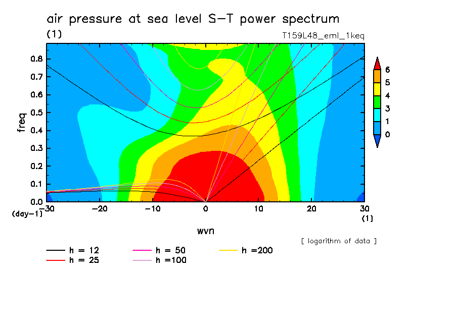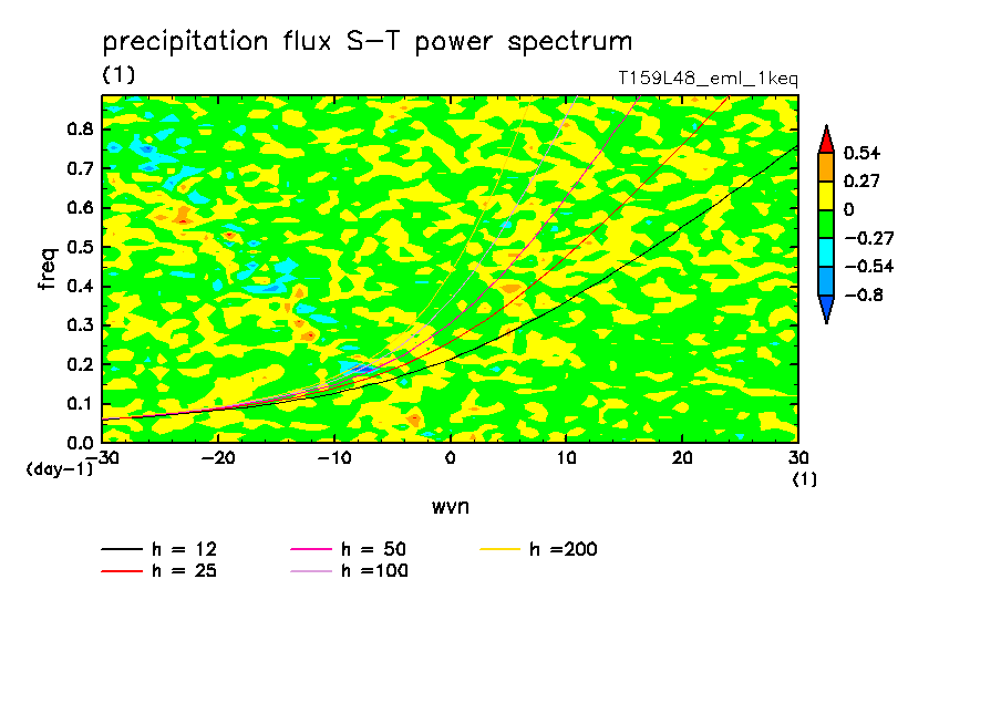 << Aqua Planet: Takayabu (1994), Wheeler and Kiladis (1999) Plot from '1keq' Experiment >> resolution: T159L48, cumulus parameterization: Emanuel scheme, radiation: every 3 hour, Original data produced: 2004/**/** on ES.