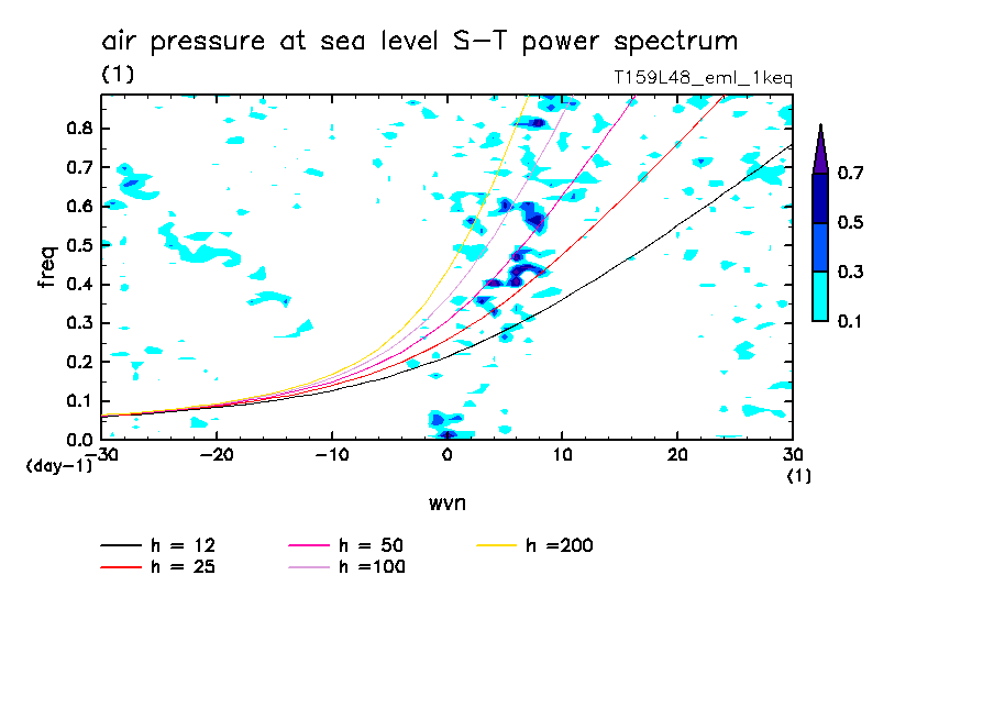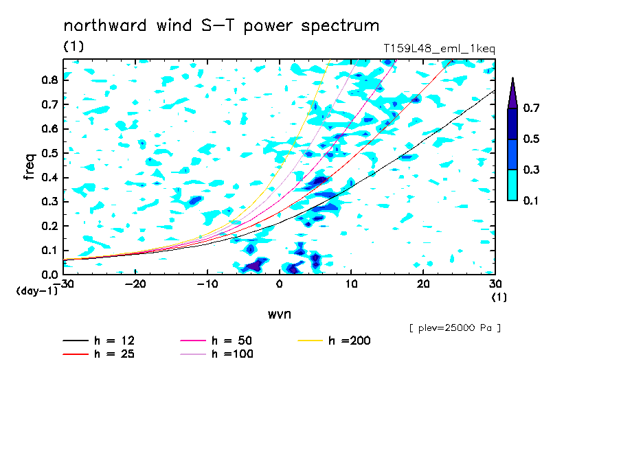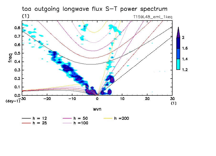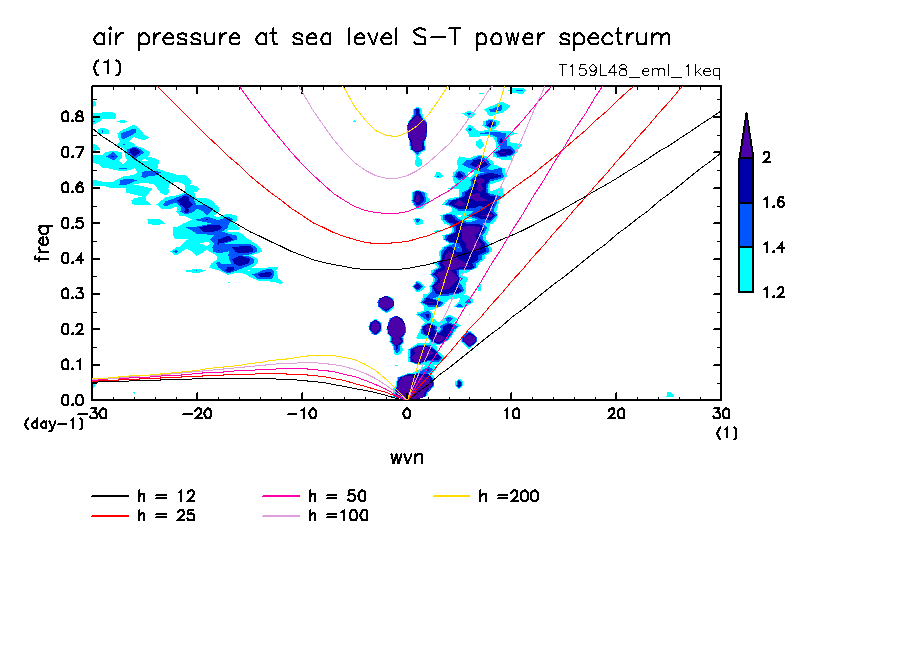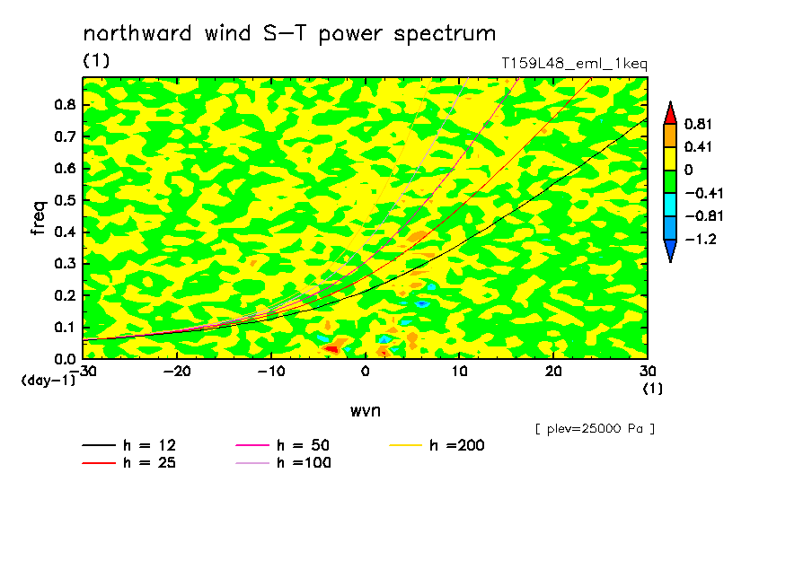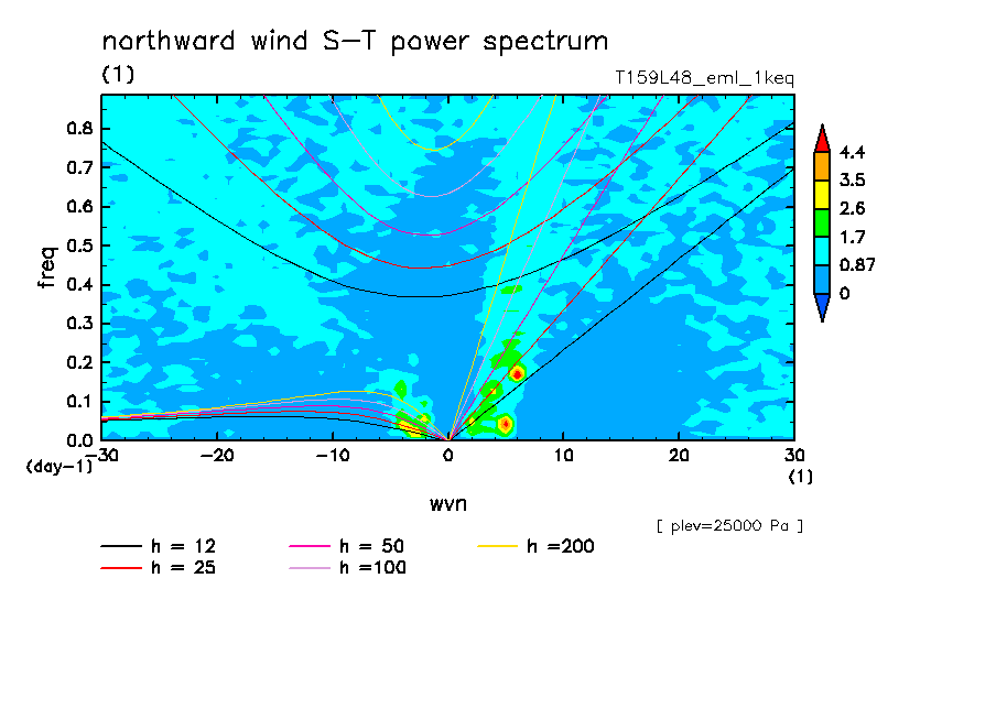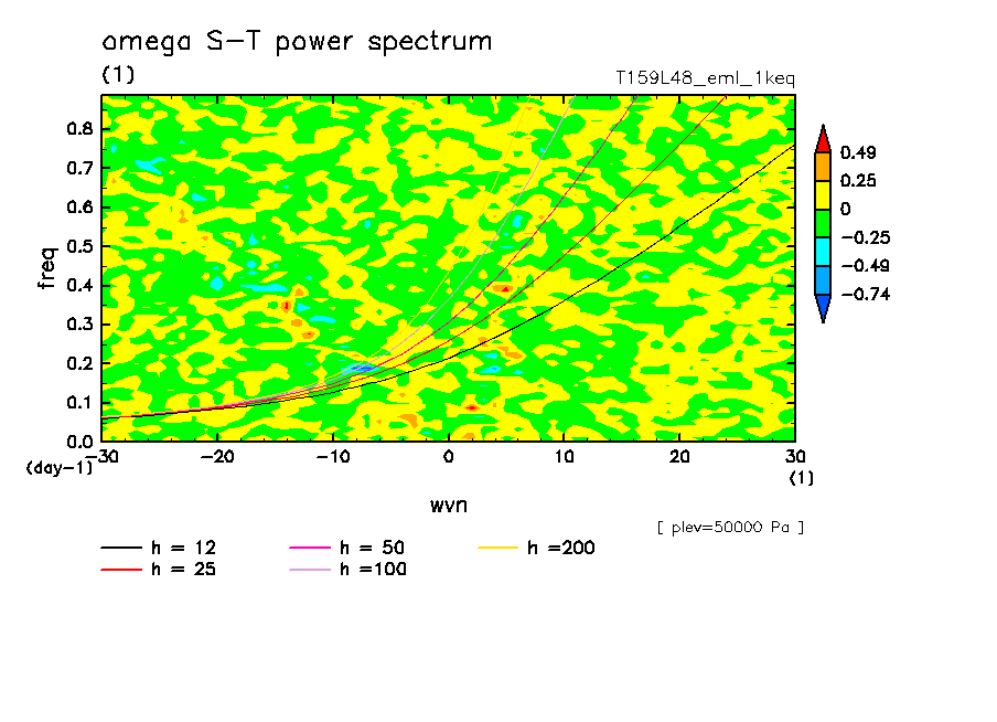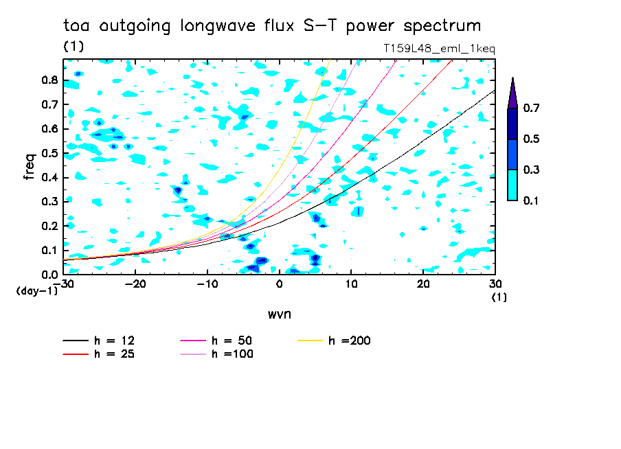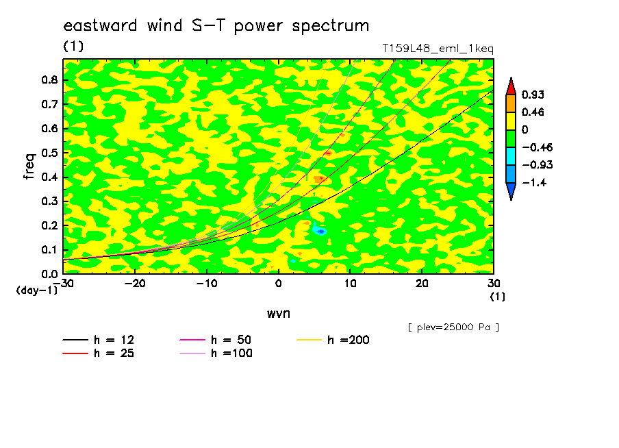 << Aqua Planet: Takayabu (1994), Wheeler and Kiladis (1999) Plot from '1keq' Experiment >> resolution: T159L48, cumulus parameterization: Emanuel scheme, radiation: every 3 hour, Original data produced: 2004/**/** on ES.