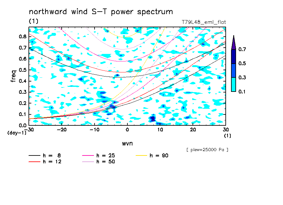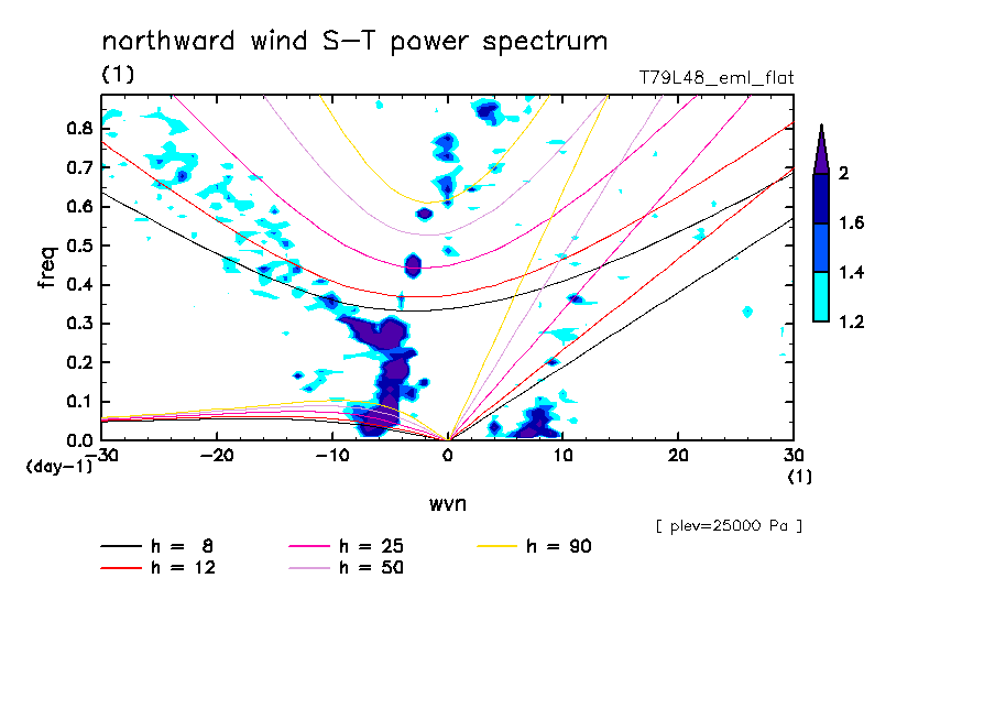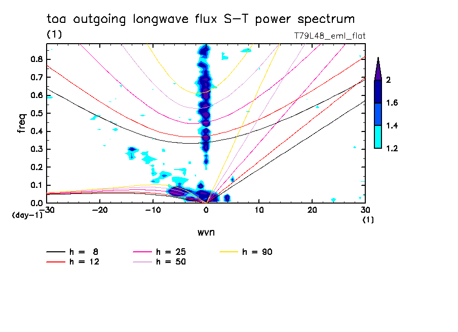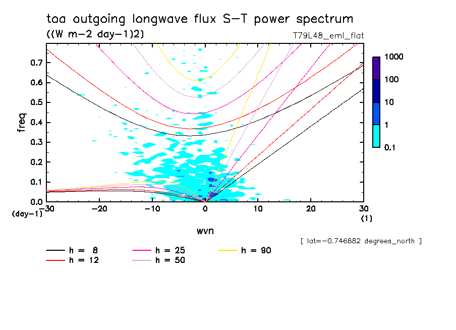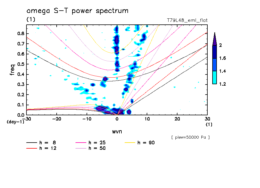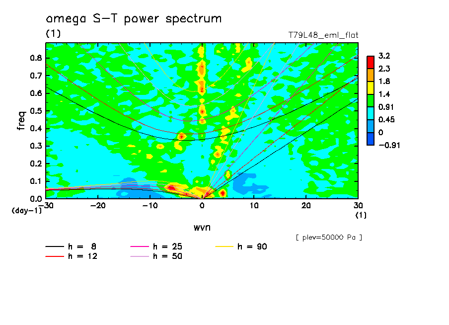 << Aqua Planet: Takayabu (1994), Wheeler and Kiladis (1999) Plot from 'flat' Experiment >> resolution: T79L48, cumulus parameterization: Emanuel scheme, radiation: every 3 hour, Original data produced: 2004/**/** on ES.