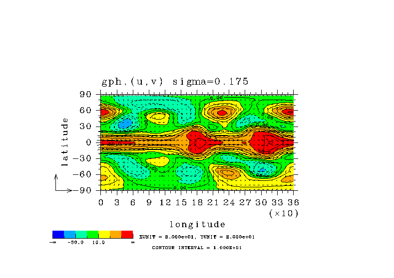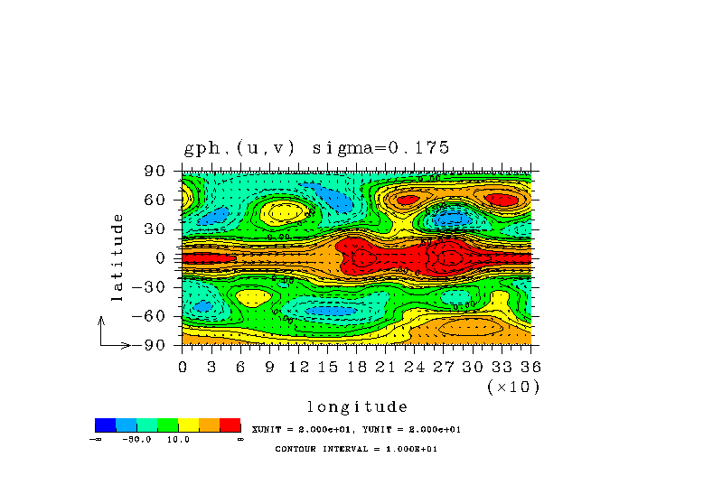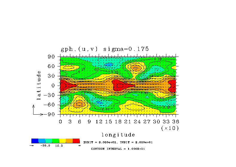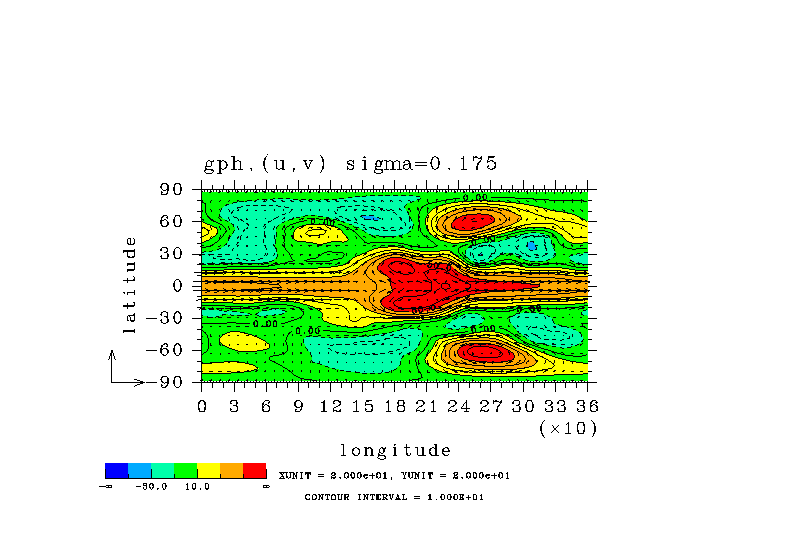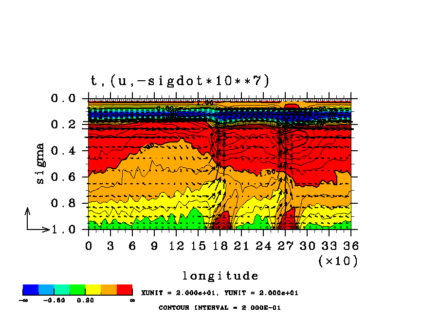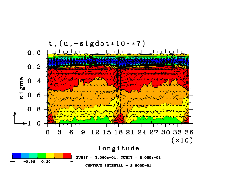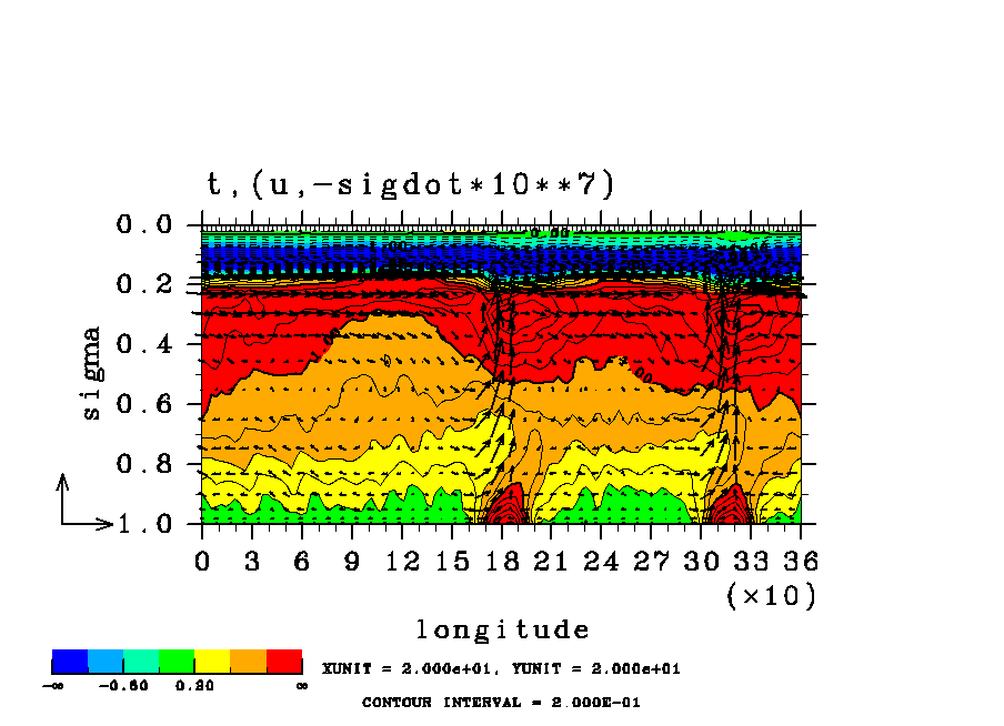 温度 + (u, -SigDot) の (x,z) 断面 at 赤道