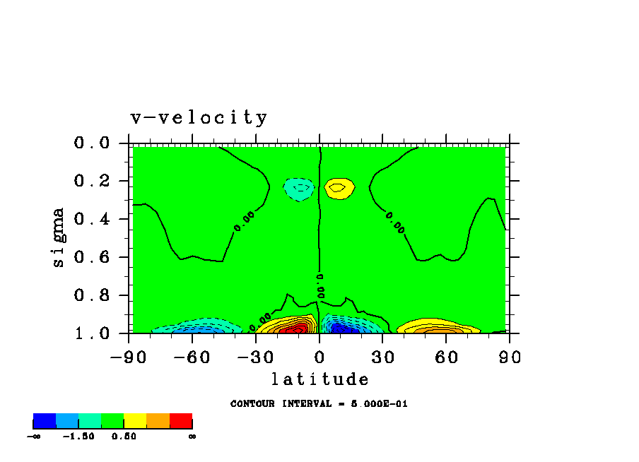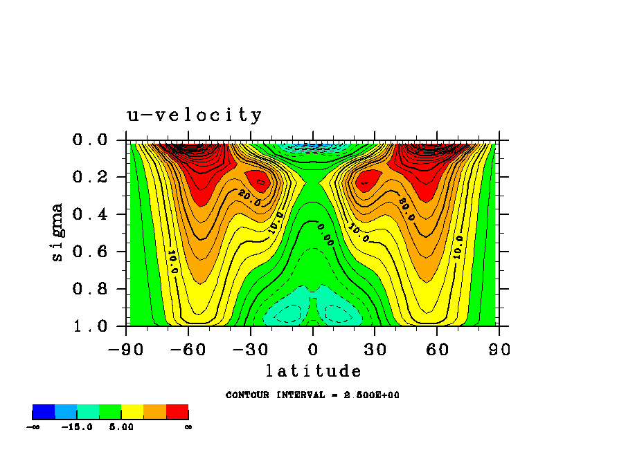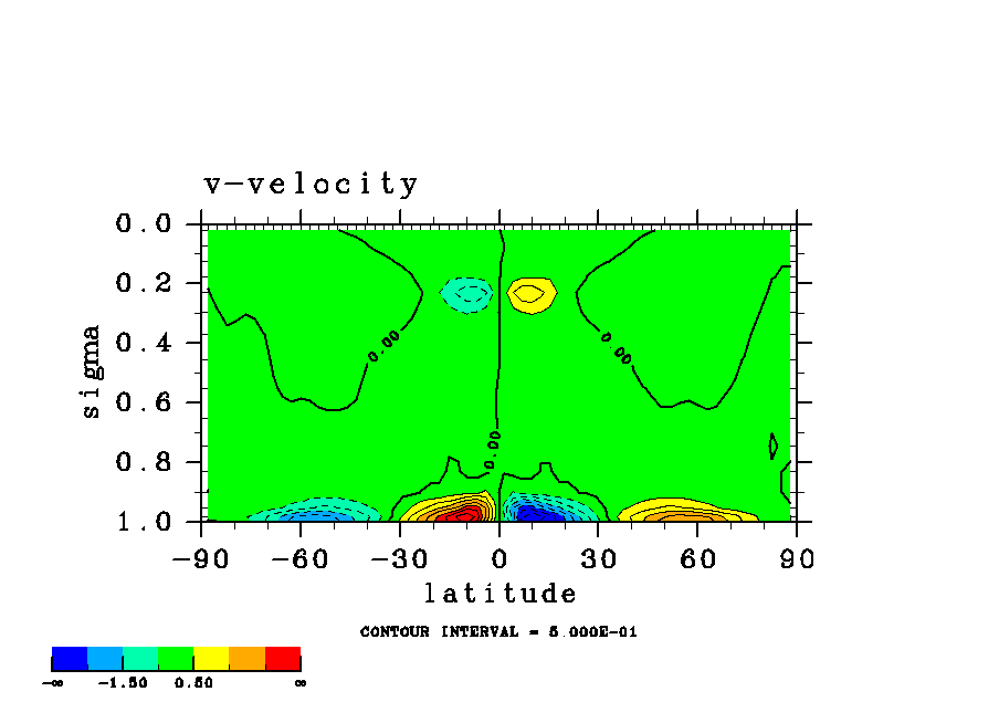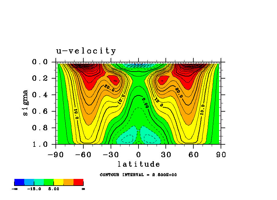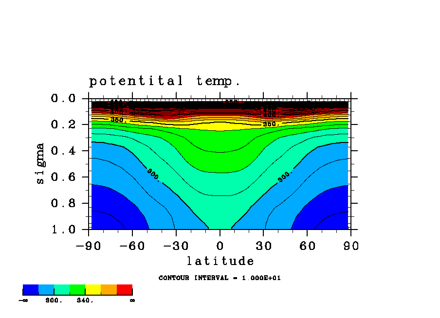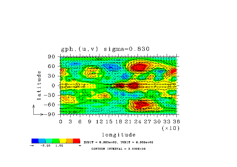 温度 + (u, -SigDot) の (x,z) 断面 at 赤道