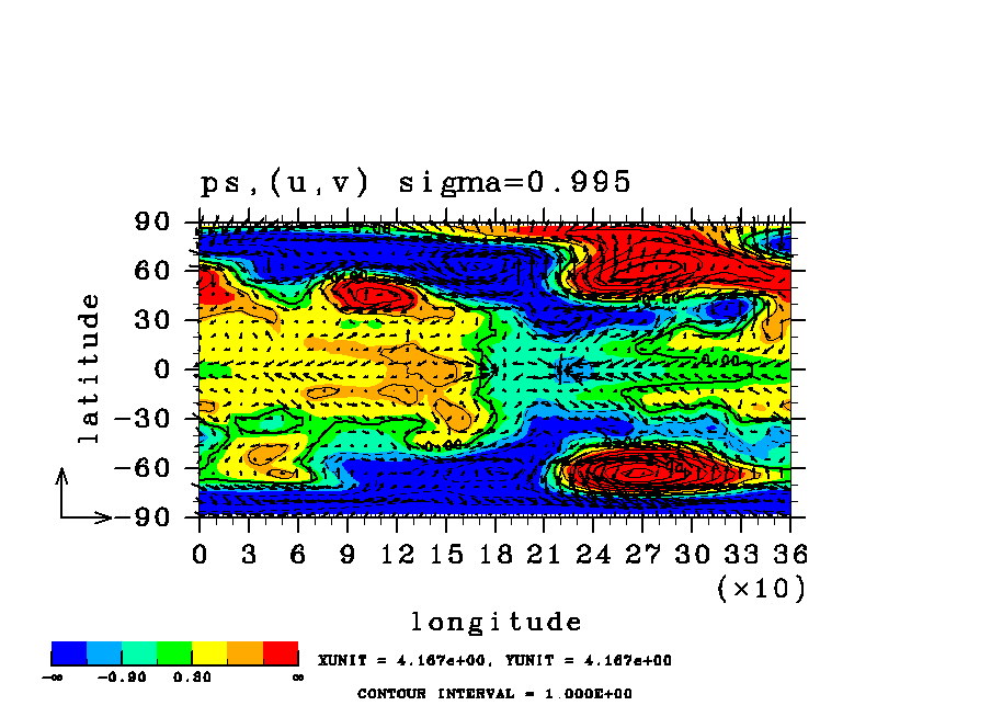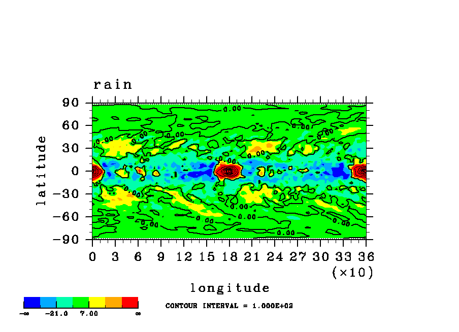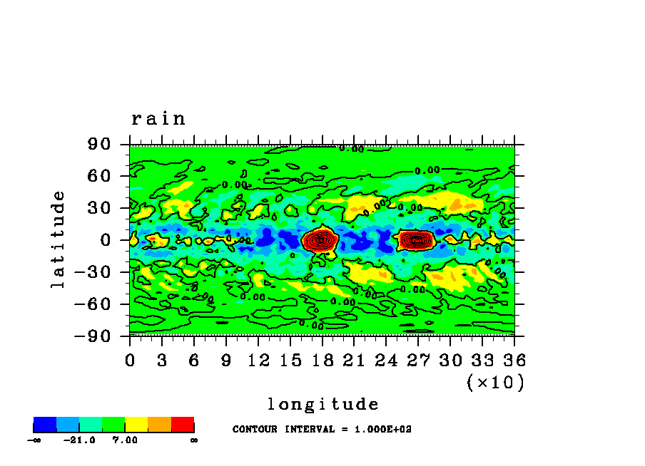 | 表面気圧の (x,y)水平分布図. | 降水の(x,y)水平分布図. (rain 瞬間値) |