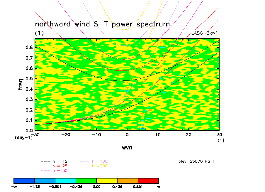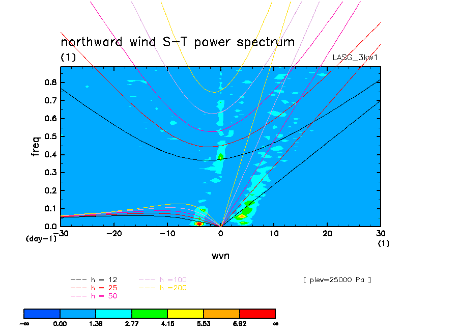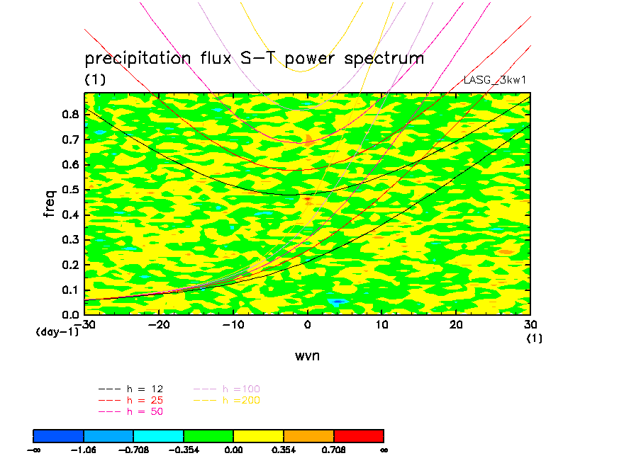 << Aqua Planet: Wheeler and Kiladis (1999) Plot from '3kw1' Experiment >> group: LASG (Institute of Atmospheric Physics (IAP), Chinese Academy of Sciences) model: LASG model