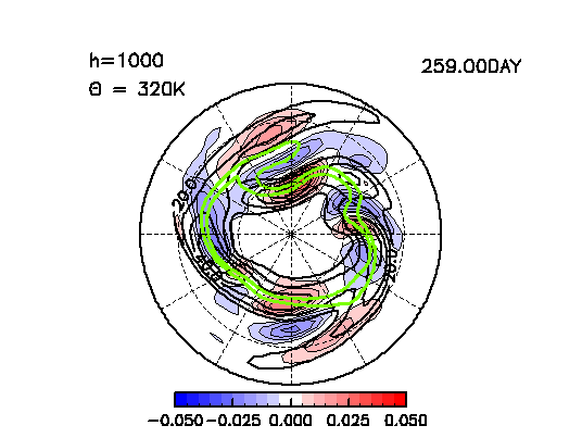 ジェットの出口で高気圧が強くなると、LC1型のブロッキングに相当する 構造となる。この場合には高気圧性の回転により高いPVが低緯度に 移流される。